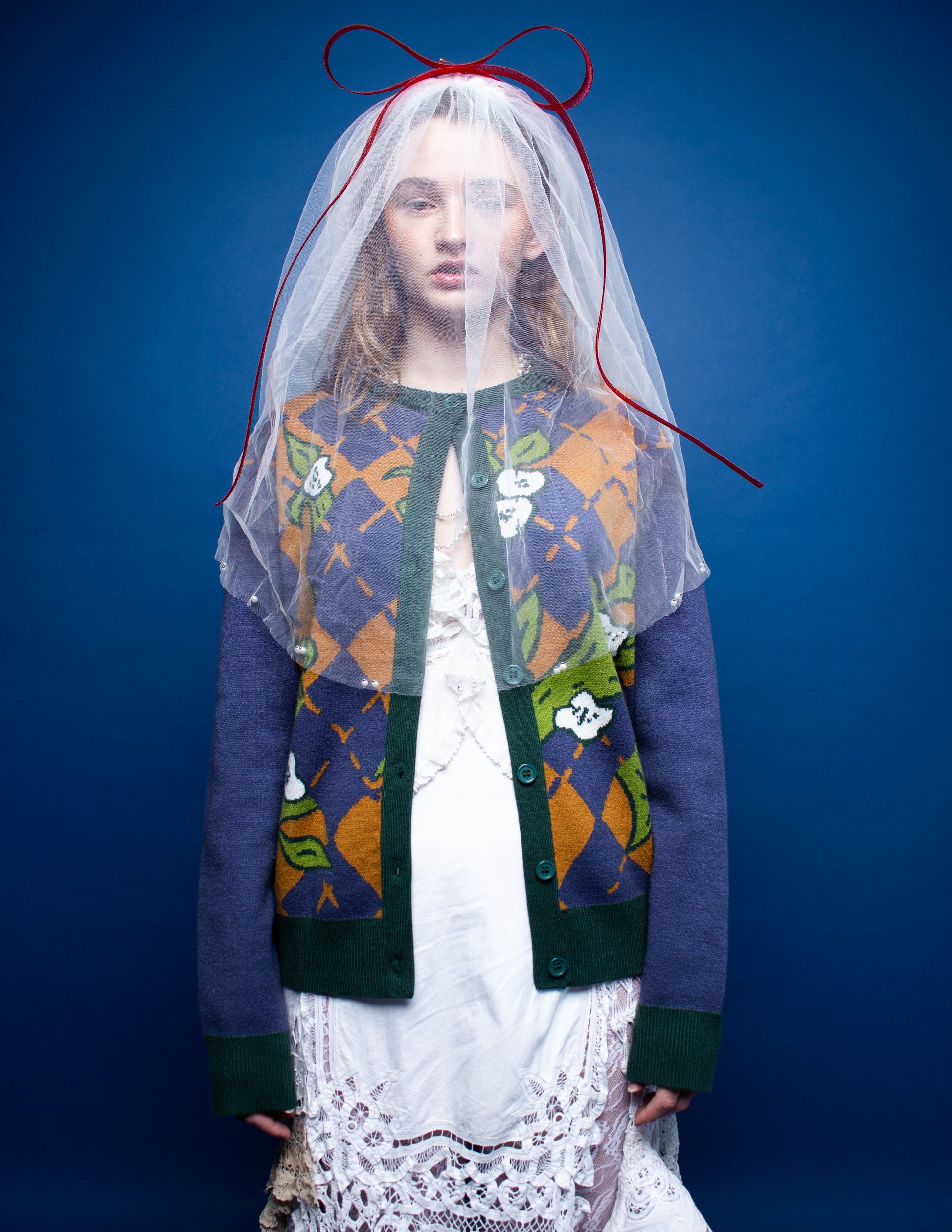 Our Botanical Argyle Cardigan starts with the familiar diamond motifs of the beloved argyle pattern. Over time, these classic lines seem to have been gently overtaken by the enchanting beauty of climbing plants. Delicate vines and leaves weave their way through the geometric shapes, creating a harmonious blend of structured sophistication and organic charm.