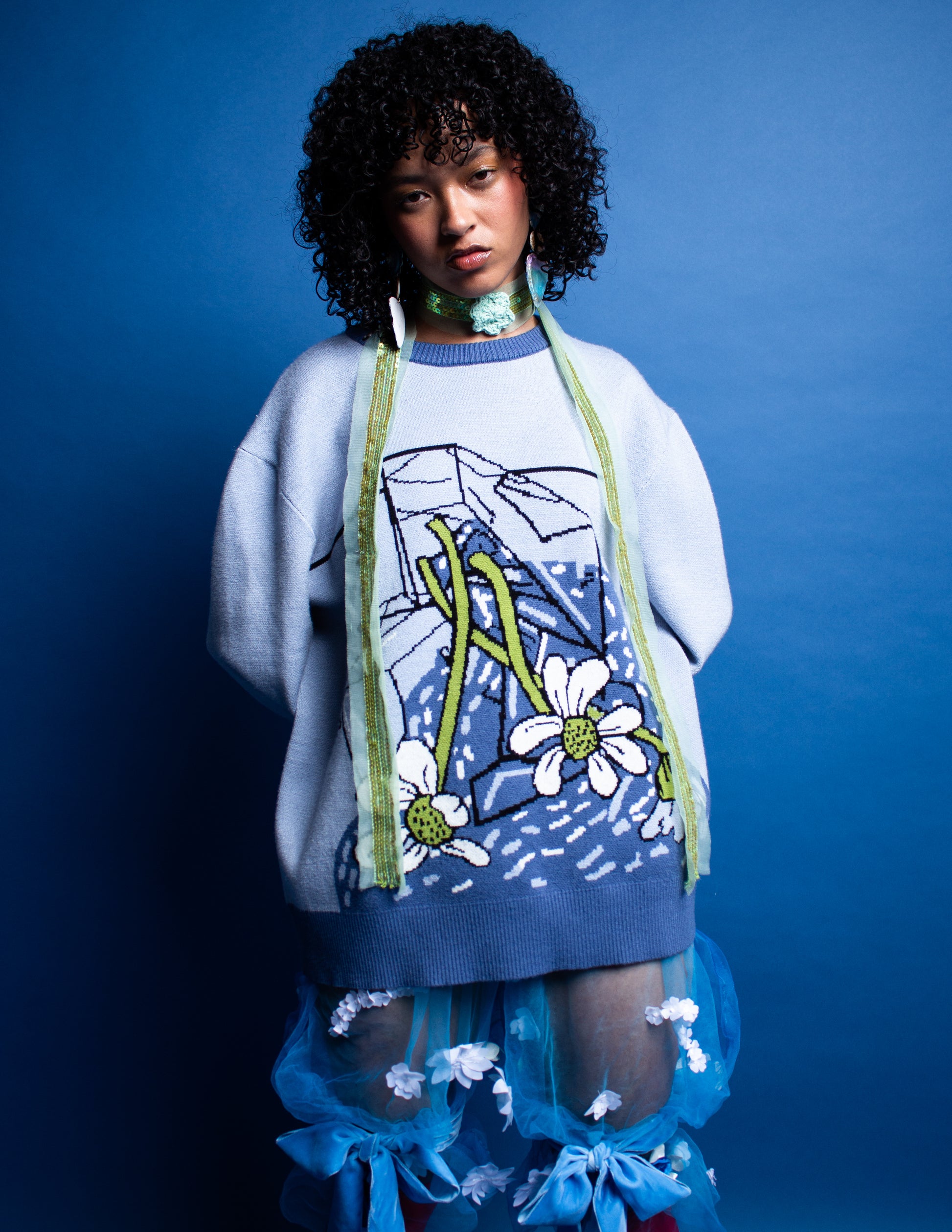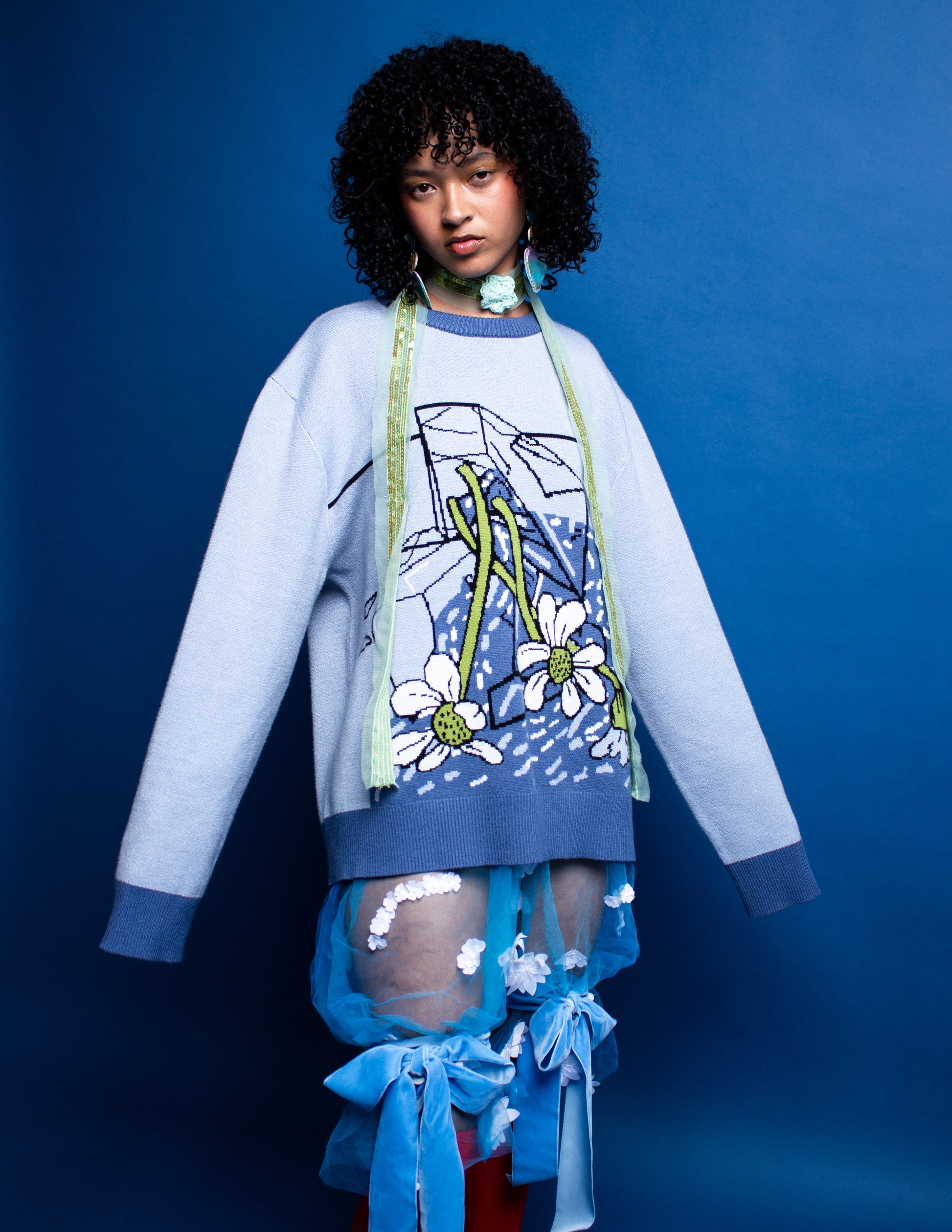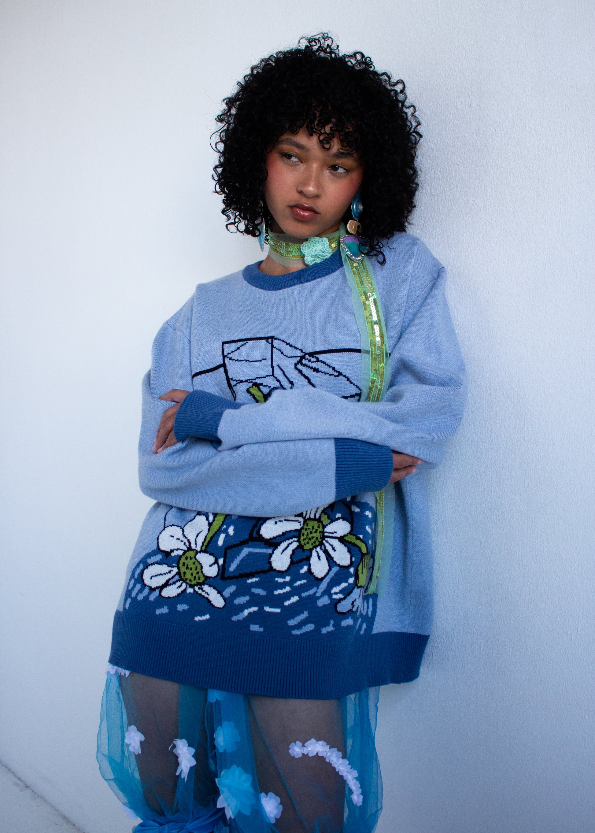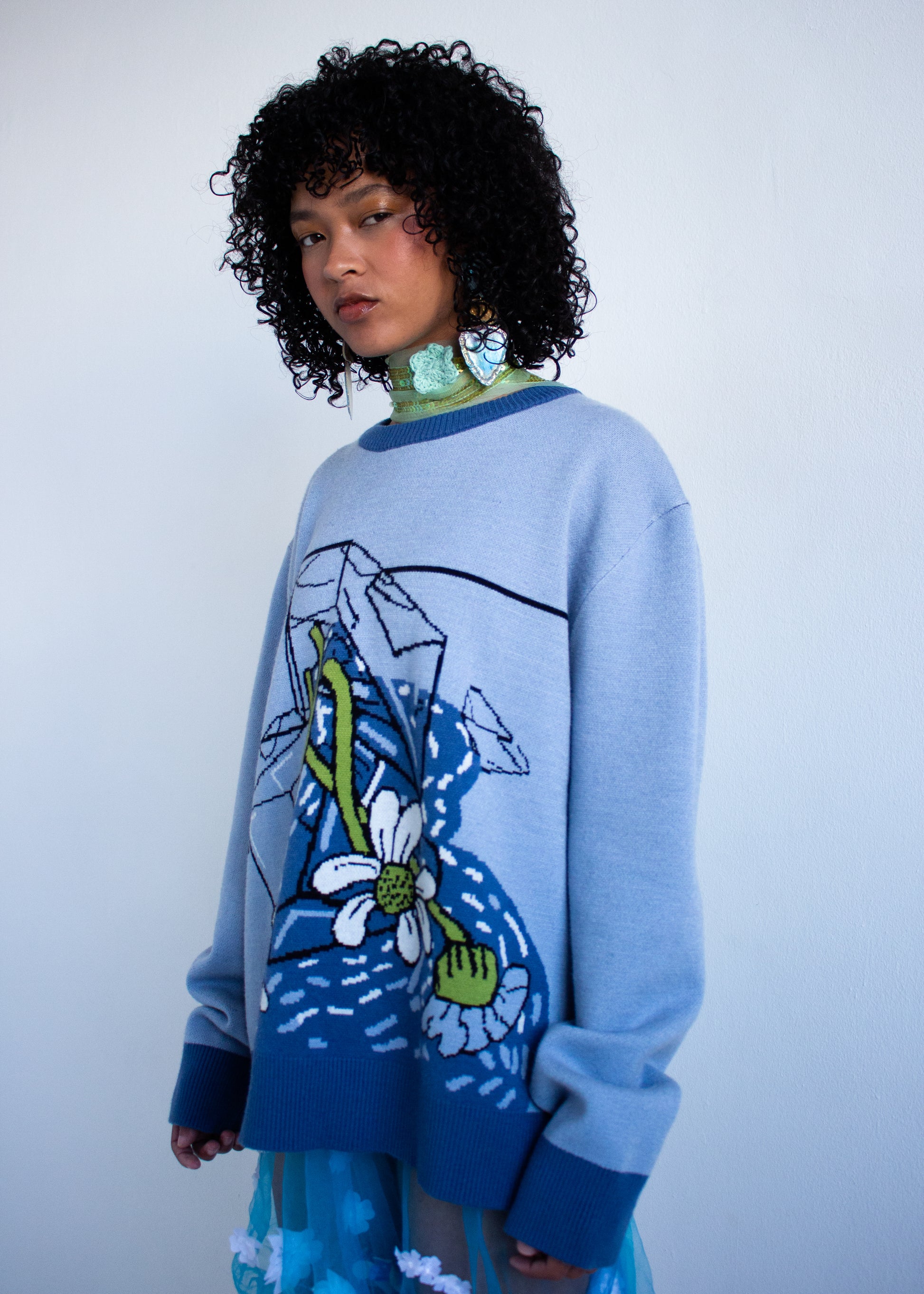 Make a statement with this unique and captivating jersey featuring a stunning broken flower vase print. The intricate design showcases a delicate vase shattered on the floor, with water flowing out and daisies scattered around it. The jacquard knit construction creates a beautiful, textured effect that gives the design a lifelike quality.
