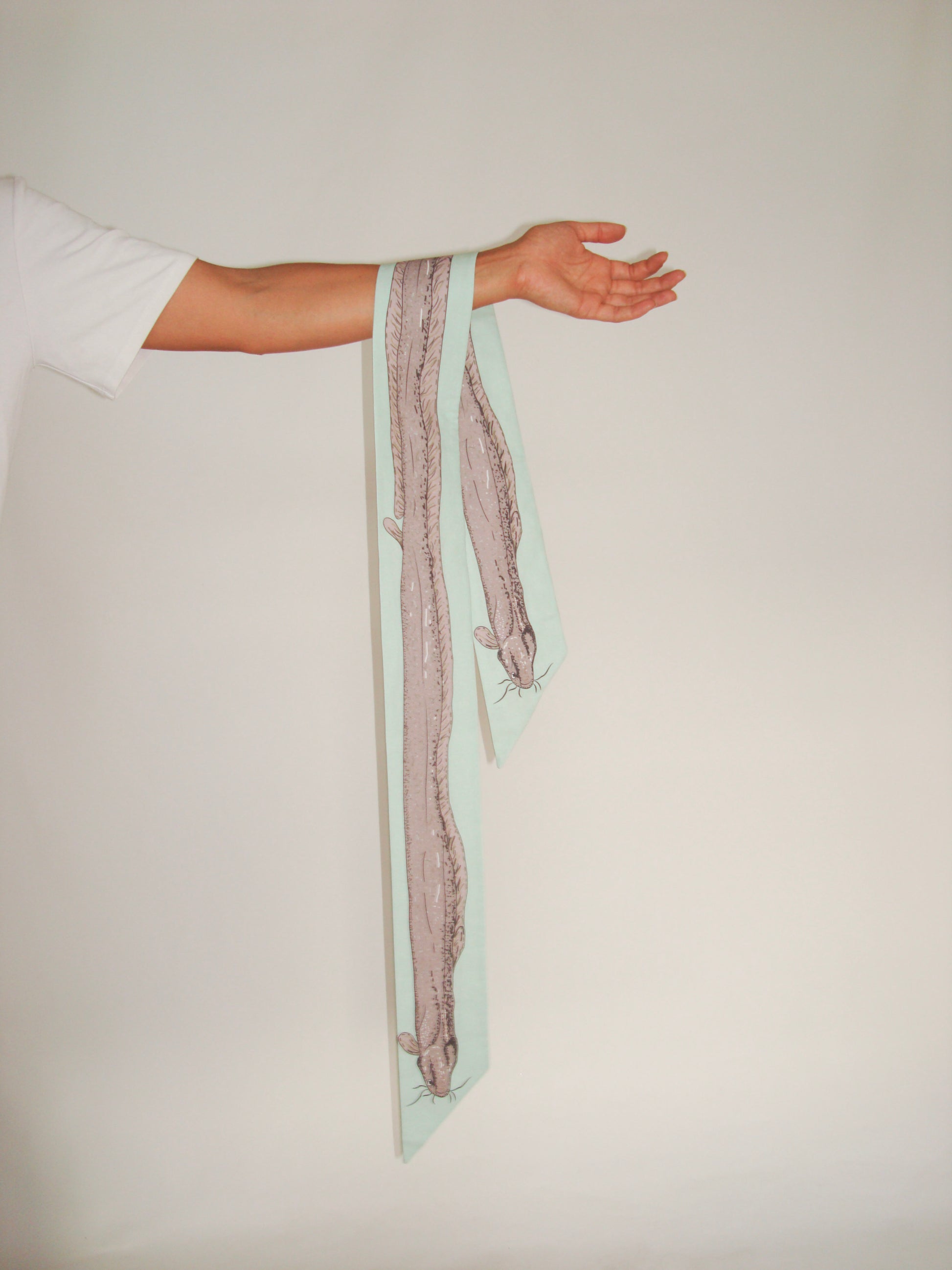 Depicting an elongated catfish, this fabric tie is perfect for adding a touch of whimsy to any look. the catfish illustration adds a subtle, nature-inspired twist, making it a standout accessory.