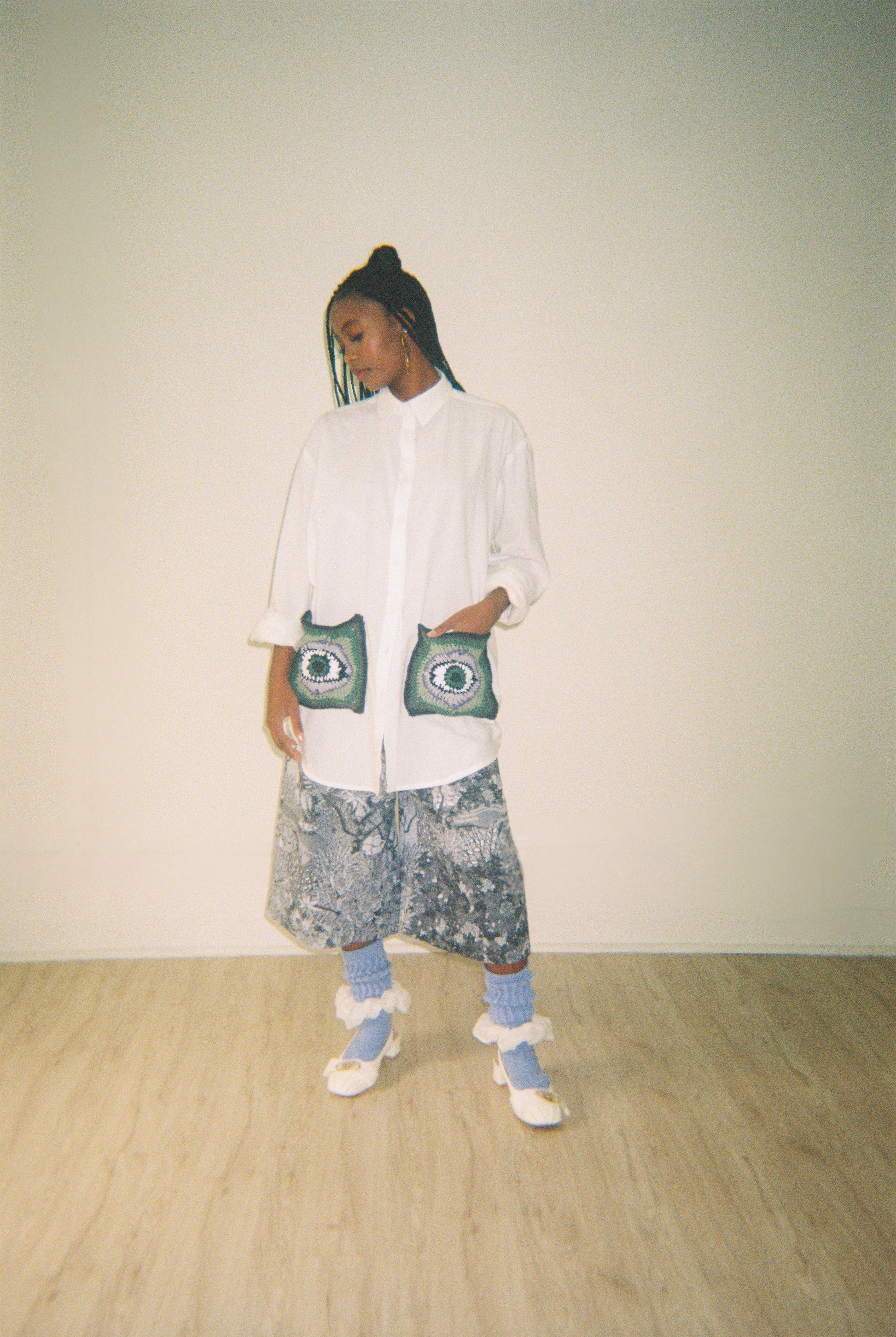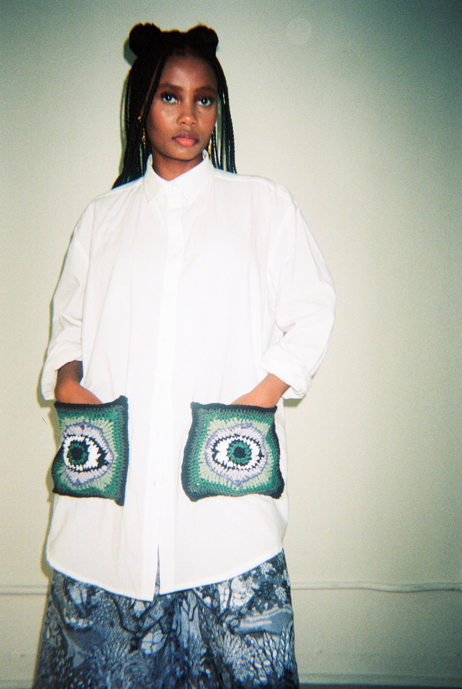 A classical white-collar shirt, finished off with two crochet pockets. This shirt is made from 100% washer cotton, giving the garment a soft and relaxed feel. The crochet pockets are handmade using 100% cotton yarn.