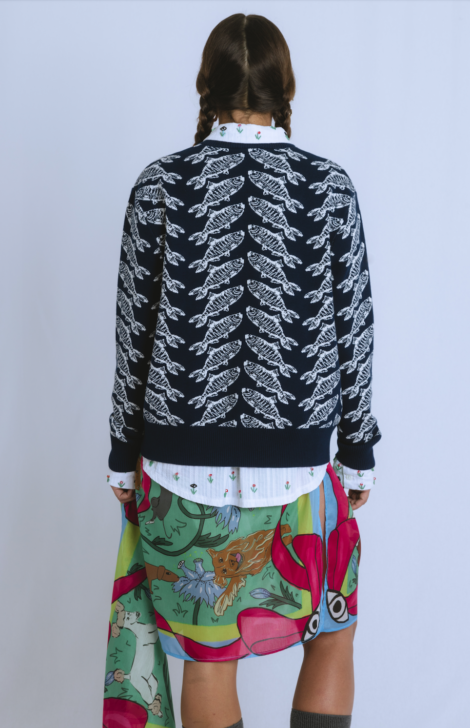 A pattern within a pattern, the Herring Herringbone is a witty take on classic knitwear. At first glance, it mimics the familiar herringbone weave—but look closer and you'll see it's actually composed of curated herringbone fish prints, artfully arranged to replicate the iconic textile motif. Crafted for comfort with a structured silhouette, this jersey blends visual pun with thoughtful design.