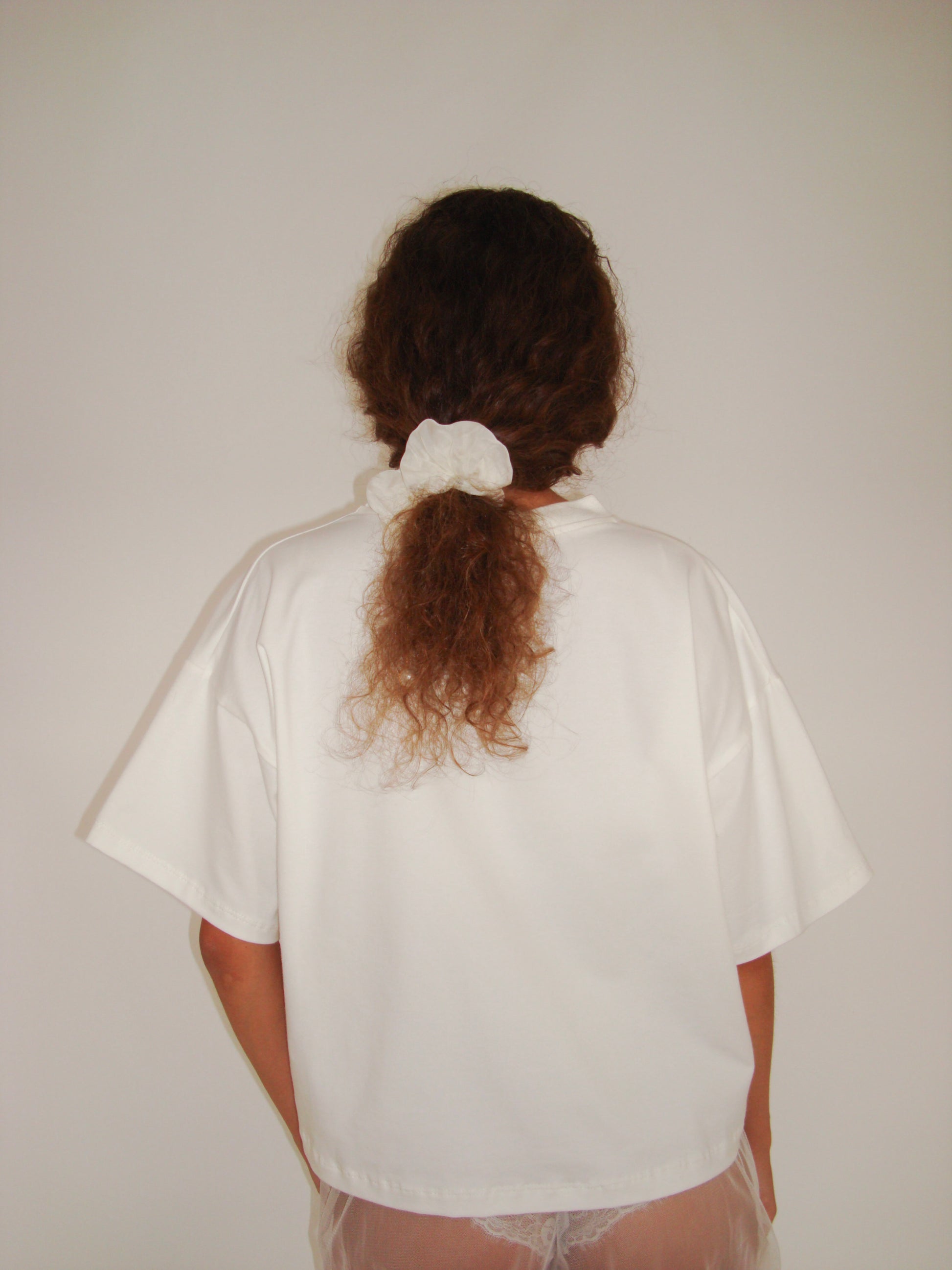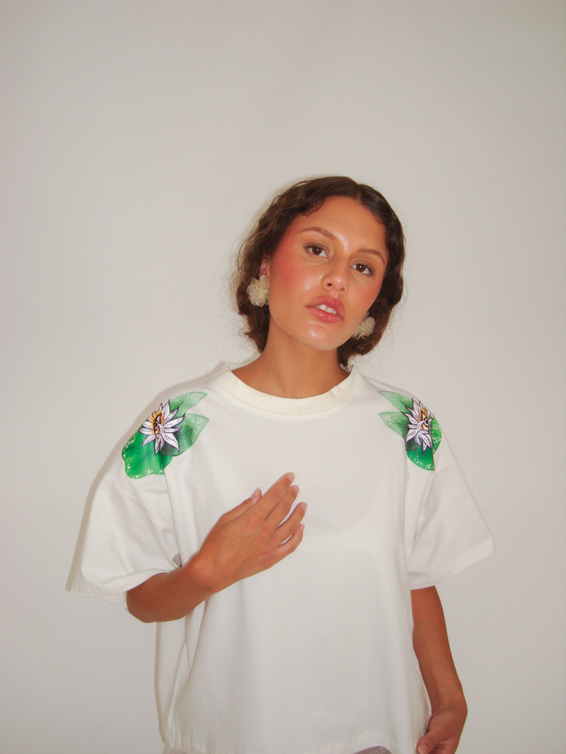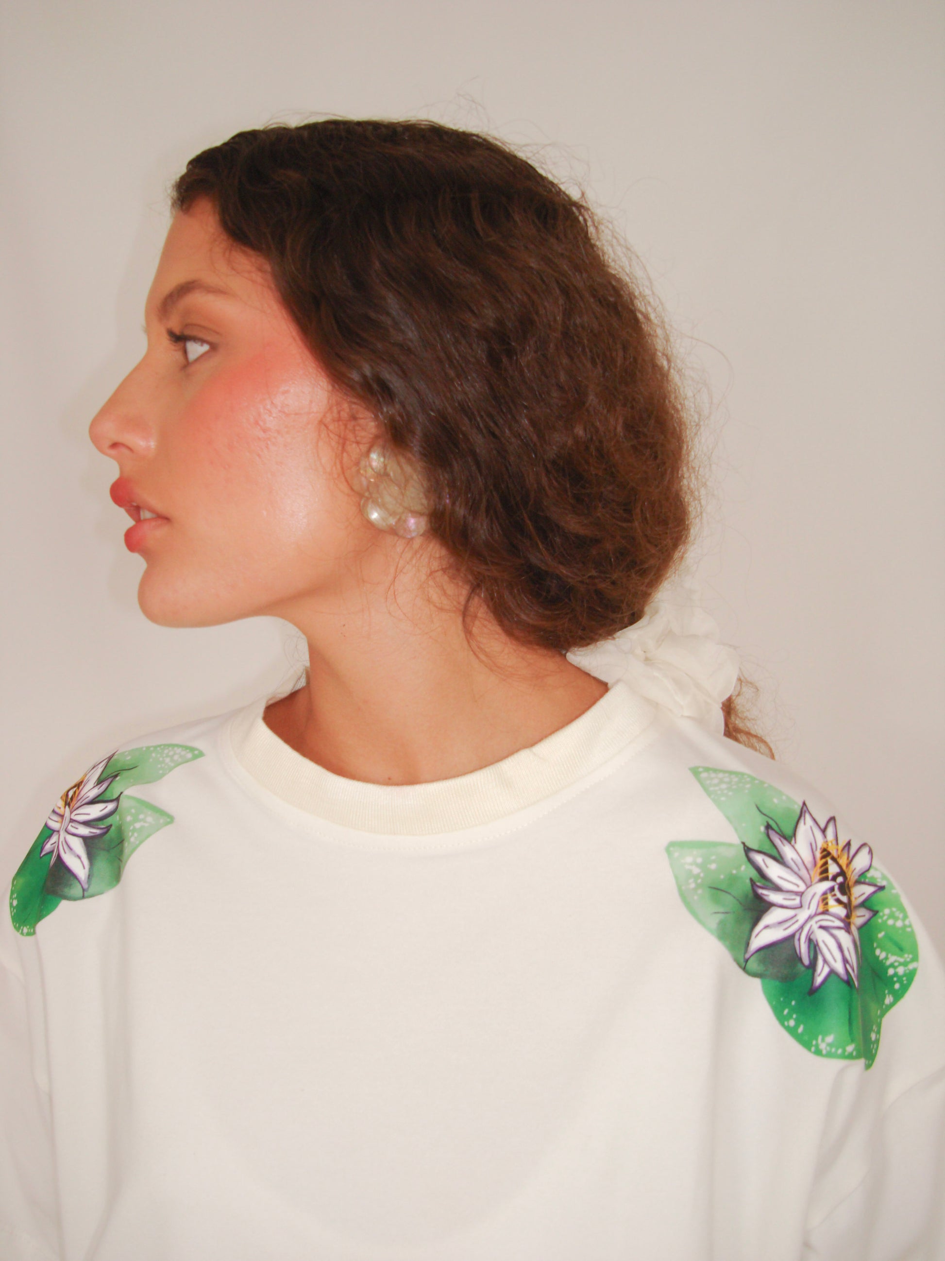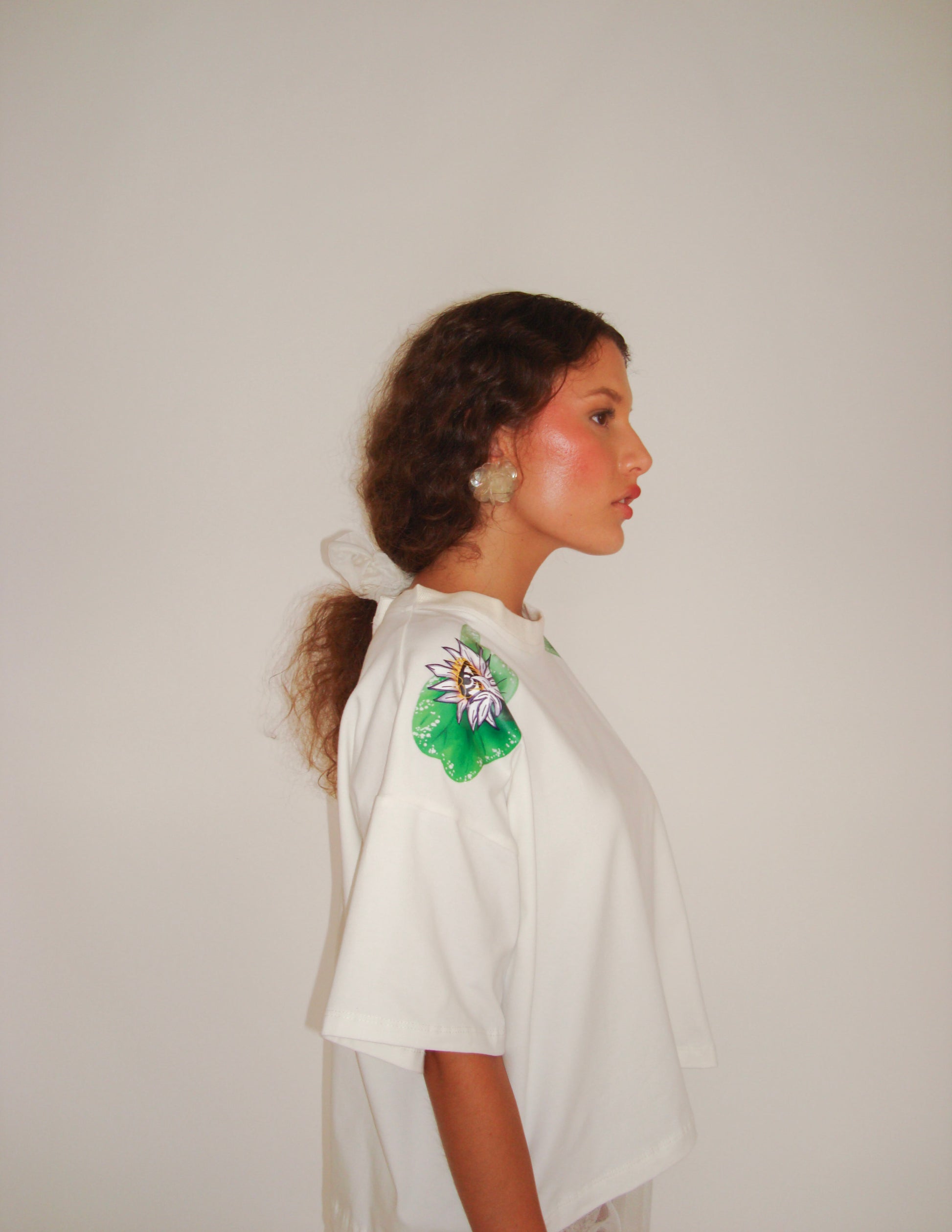 Add some fun to your wardrobe with this playful graphic T-shirt, showcasing a delicate lily design on each shoulder, complemented by vibrant green leaves. Crafted from soft, high-quality unbleached cotton, this oversized white shirt combines comfort and style effortlessly. Its cropped cut and relaxed fit provides for a casual and relaxed look.