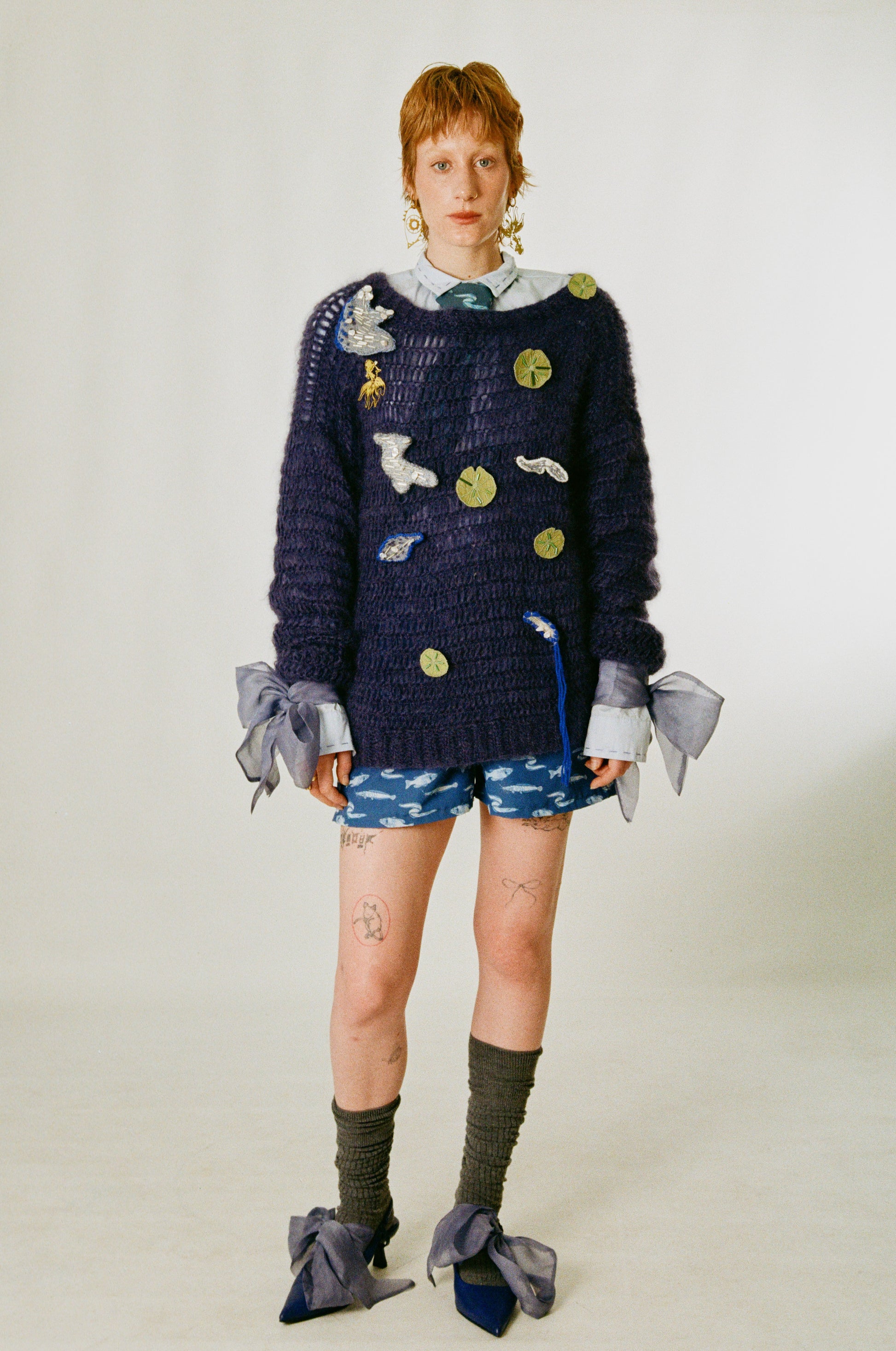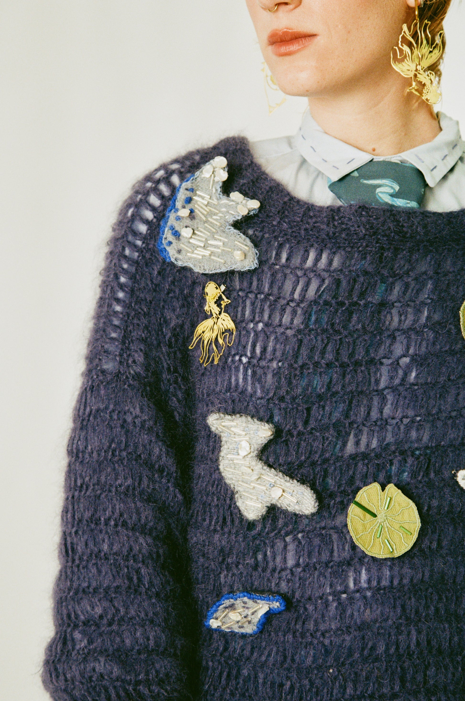 The knit features a selection of handcrafted fabric brooches, which can be artfully arranged into different pond scenes for each wear. The brooches are inspired by water reflections and Fauna and flora found within fresh bodies of water.