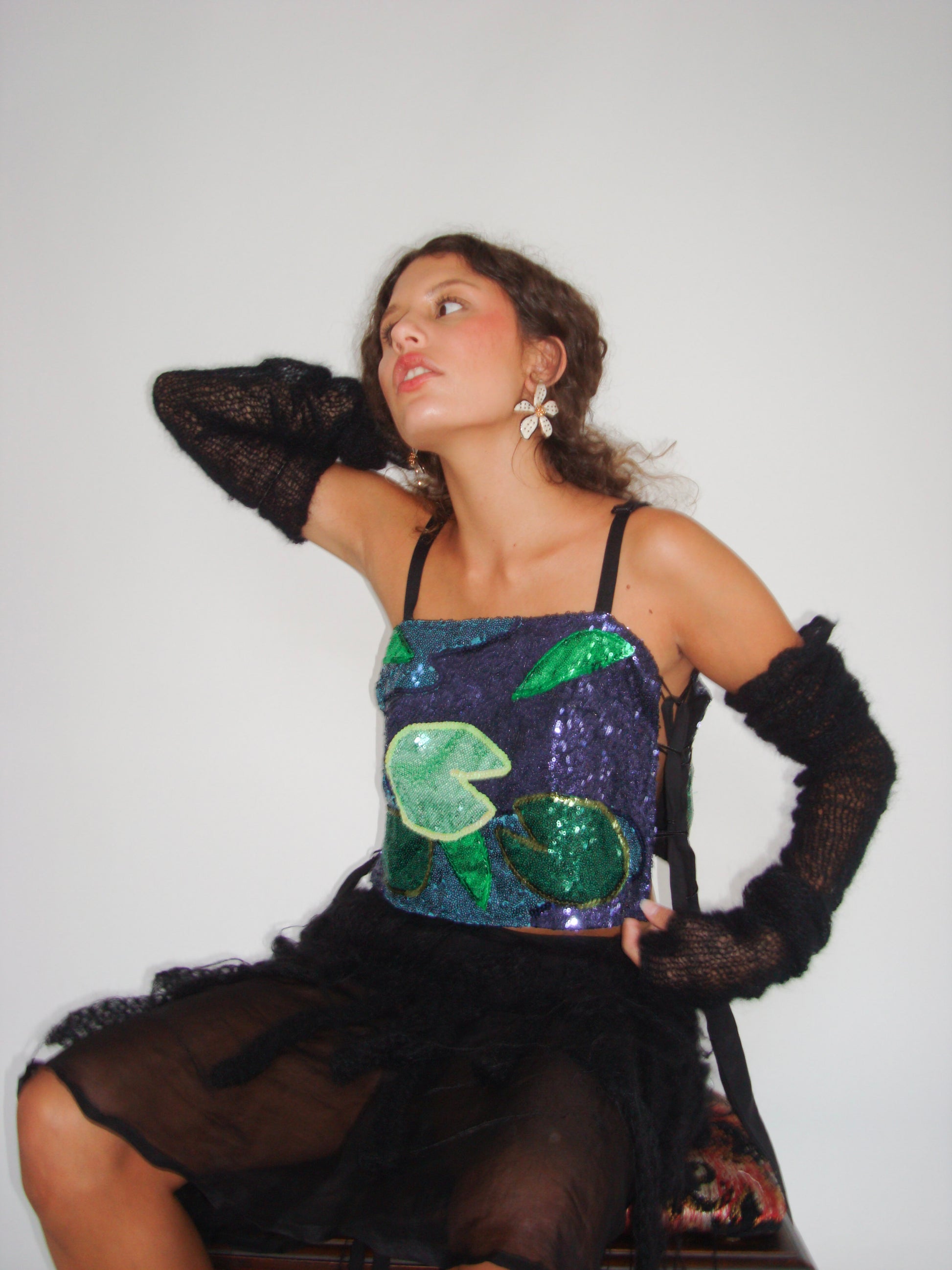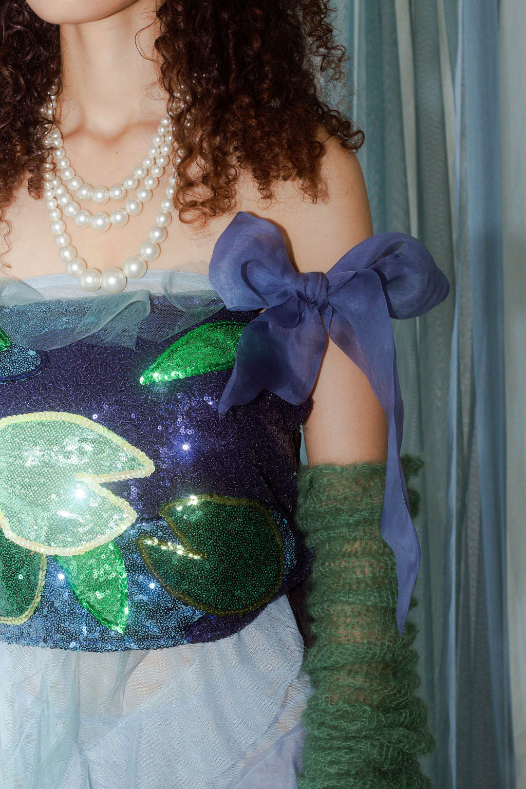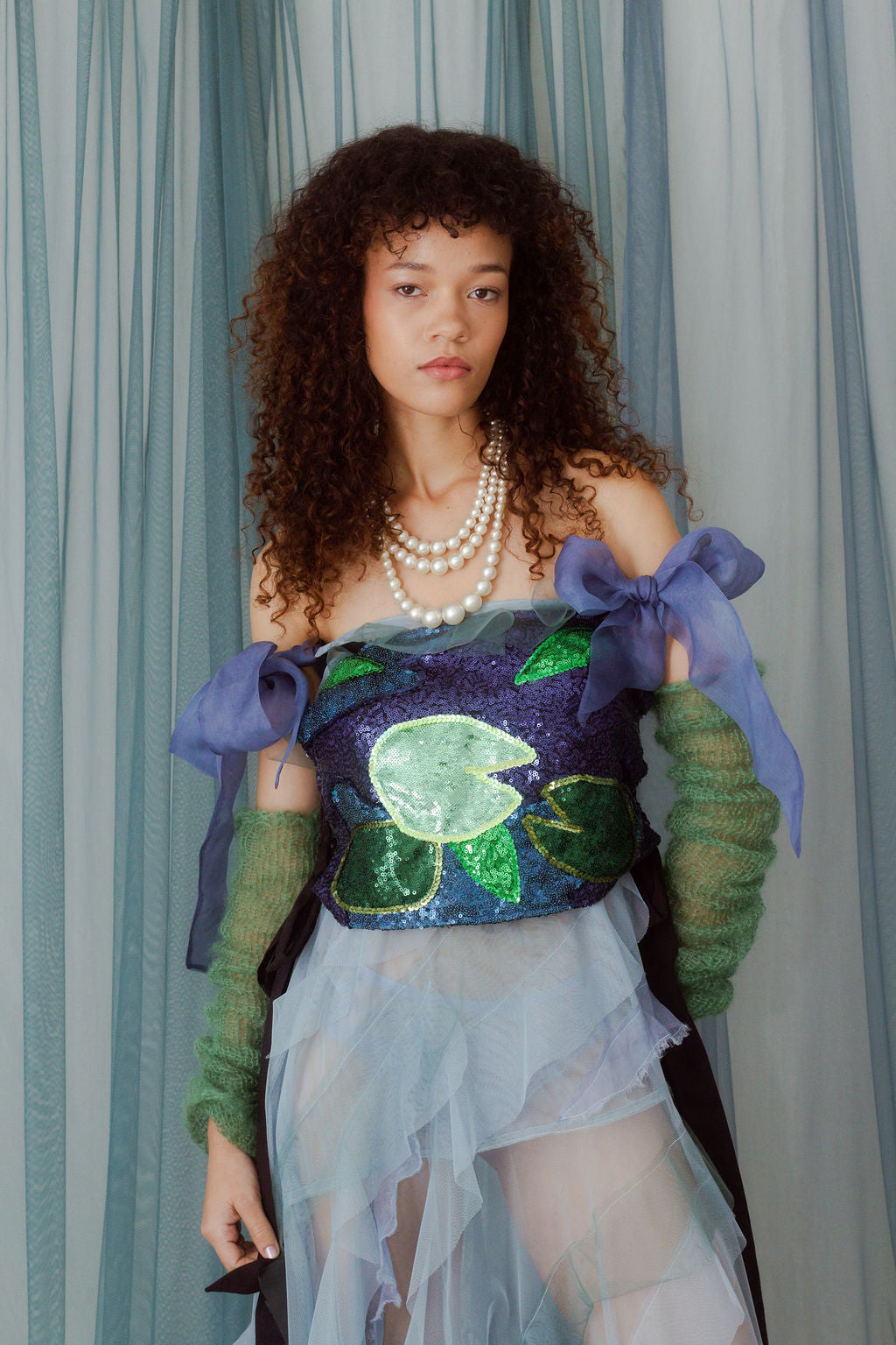 Bring a serene pond scene to life with this eye-catching sequin top inspired by a peaceful pond. Impressions of lily pads and glistening water is executed in a layered applique technique, done in various sequin fabrics and trims