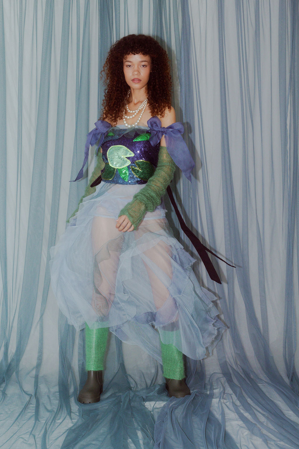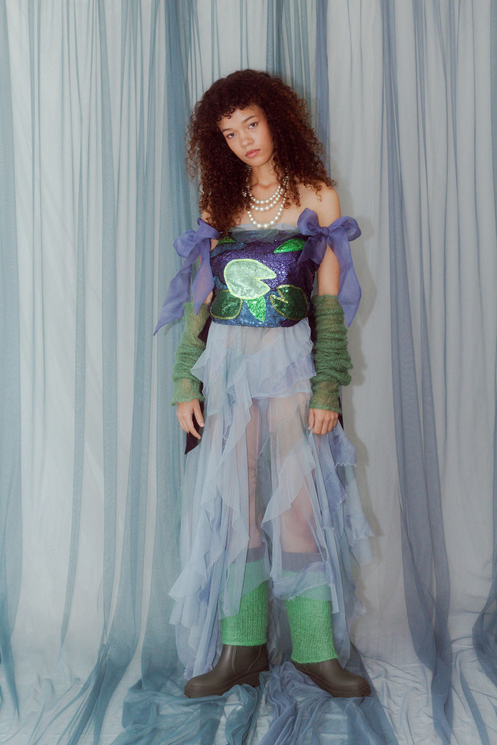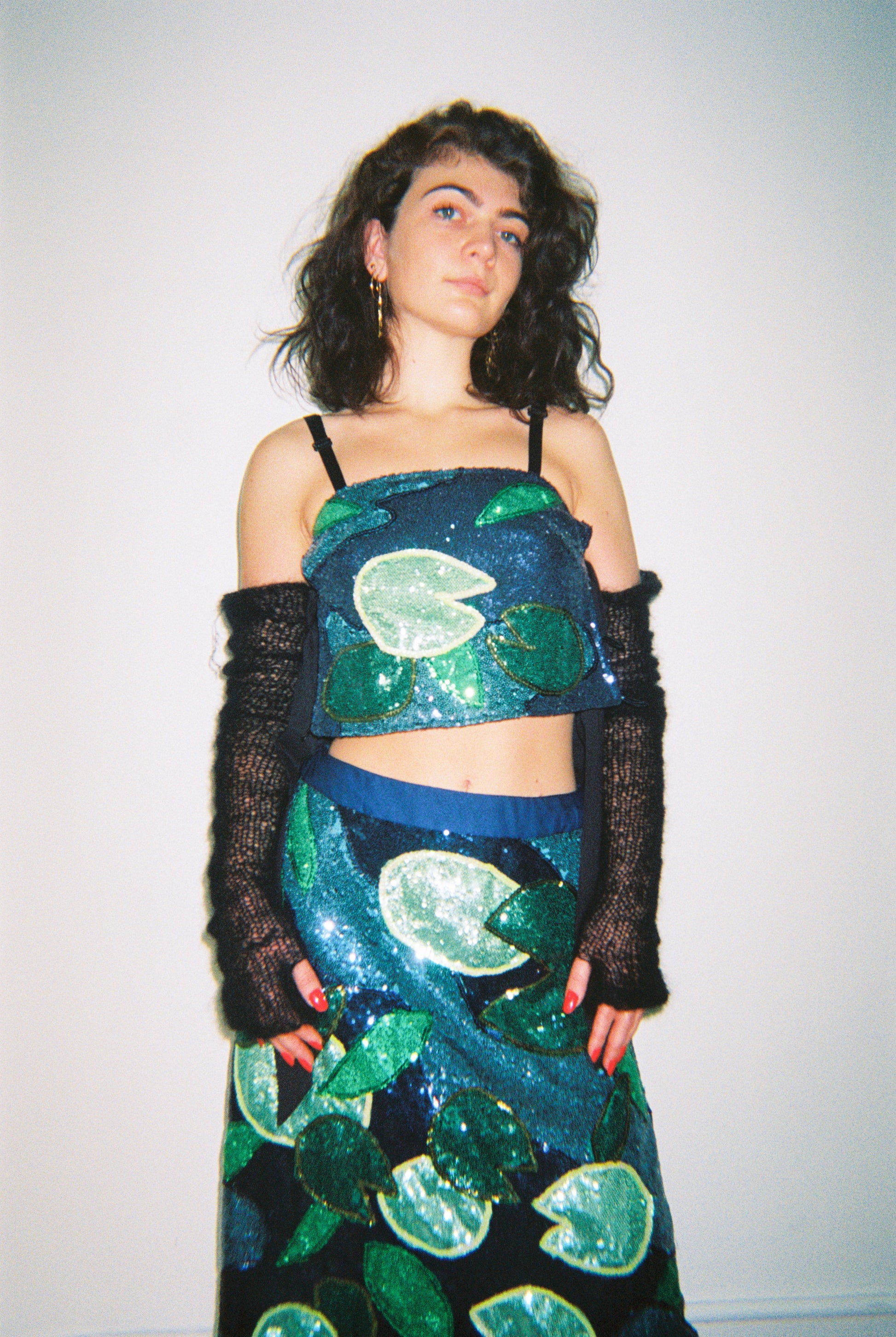 Bring a serene pond scene to life with this eye-catching sequin top inspired by a peaceful pond. Impressions of lily pads and glistening water is executed in a layered applique technique, done in various sequin fabrics and trims