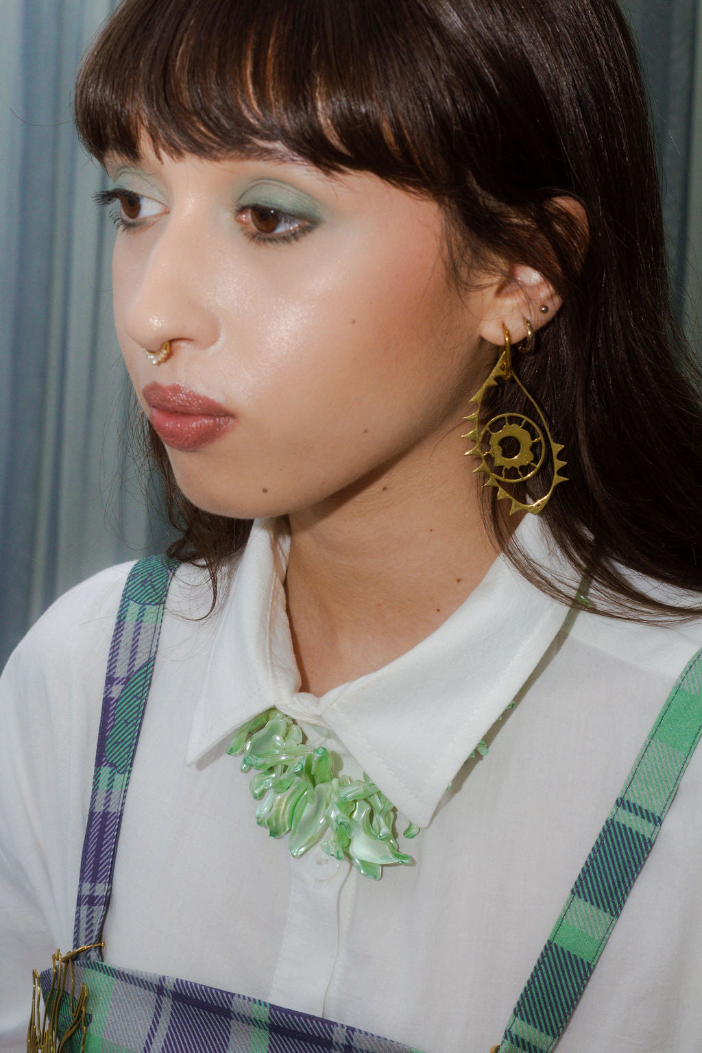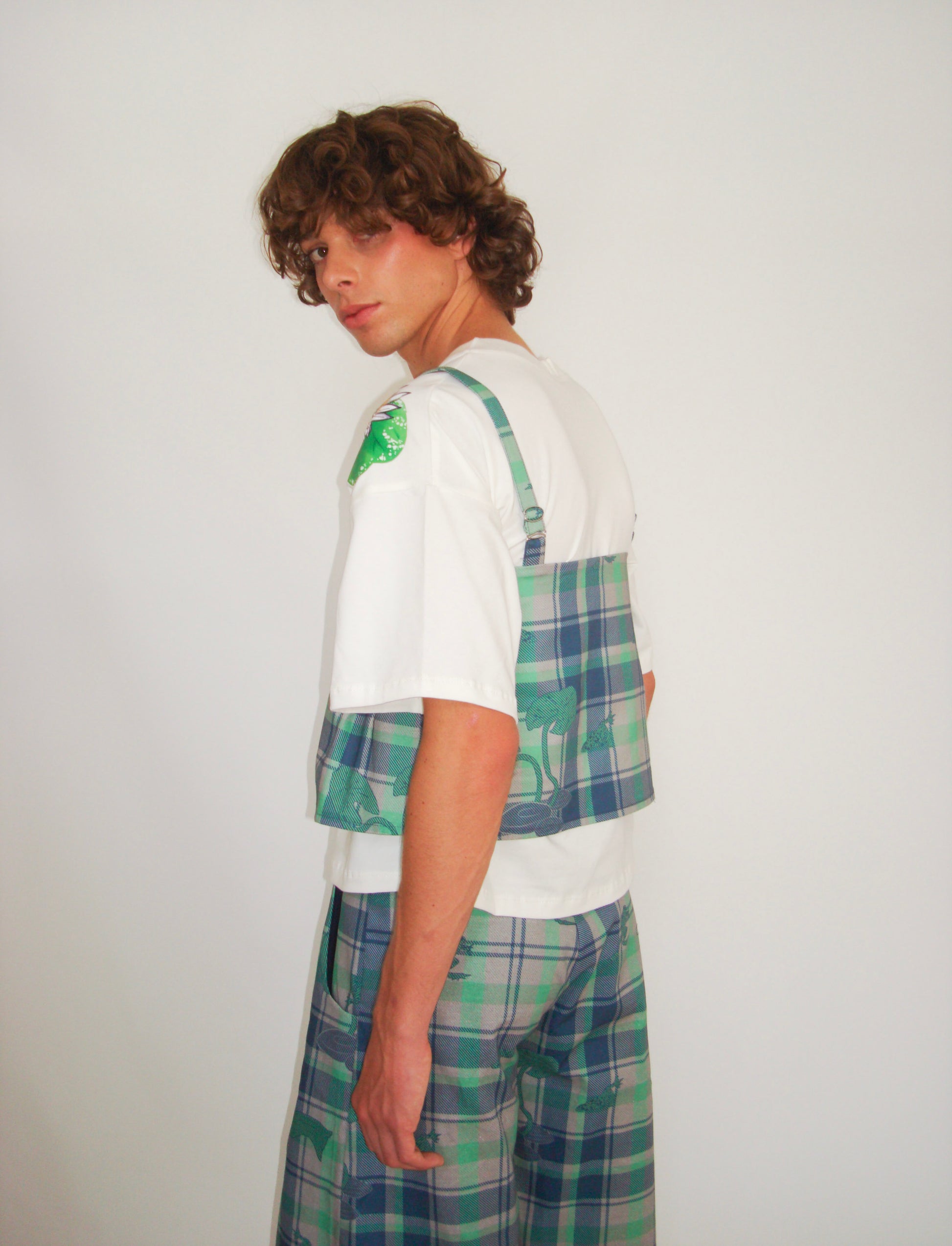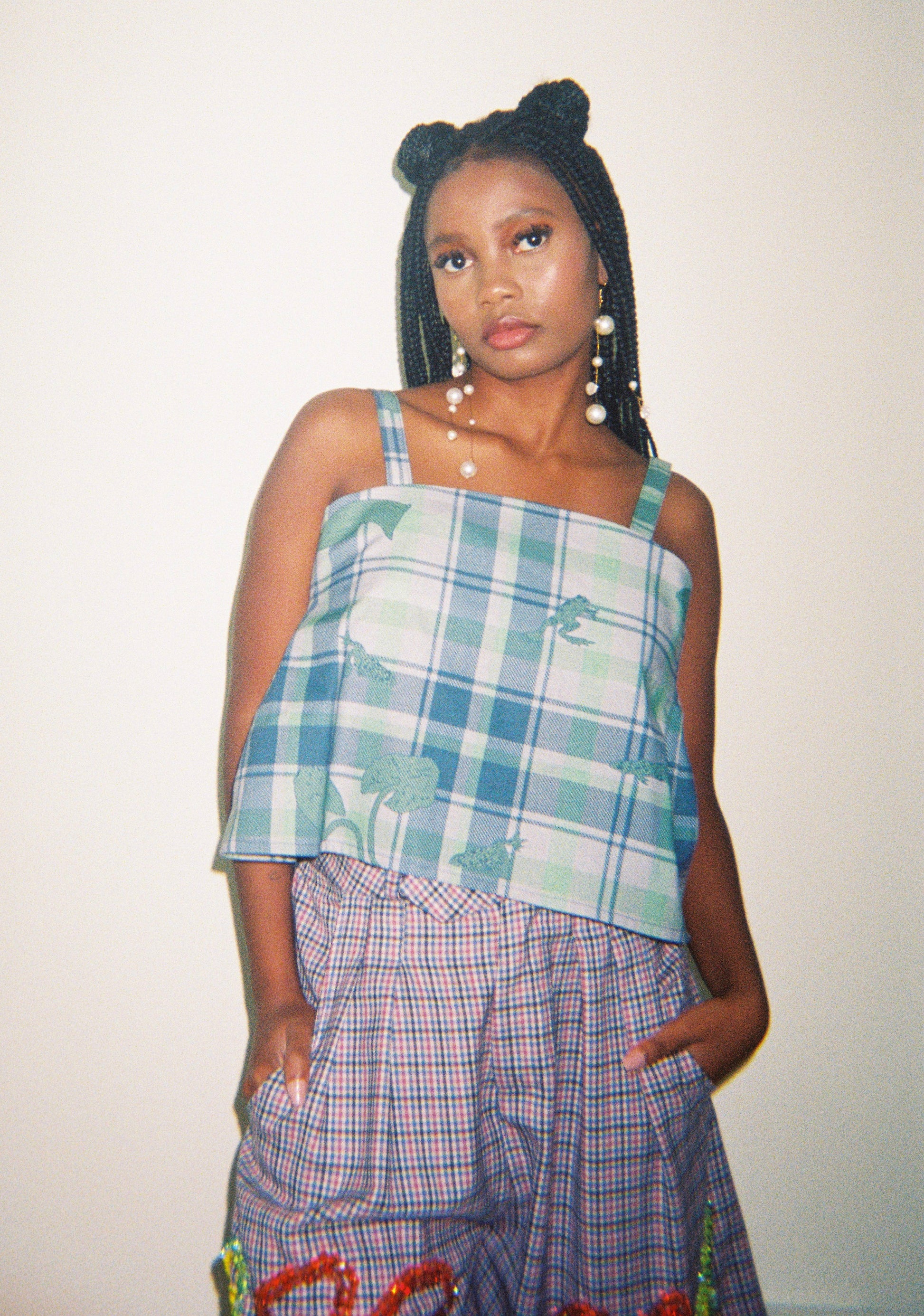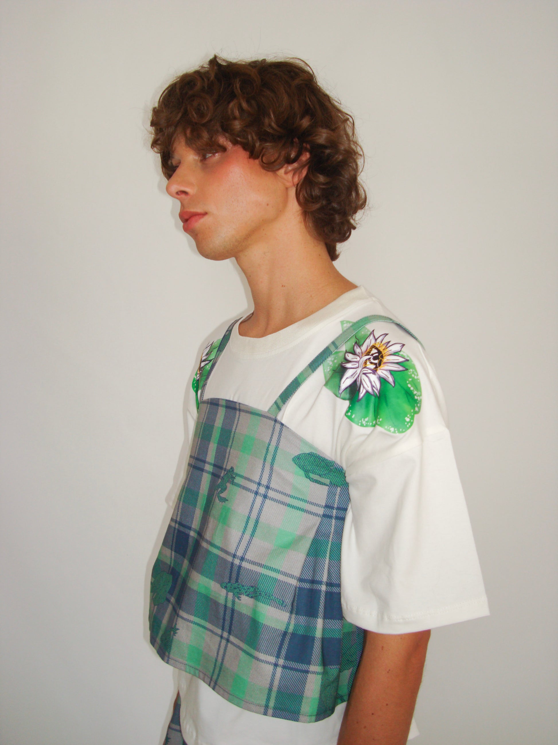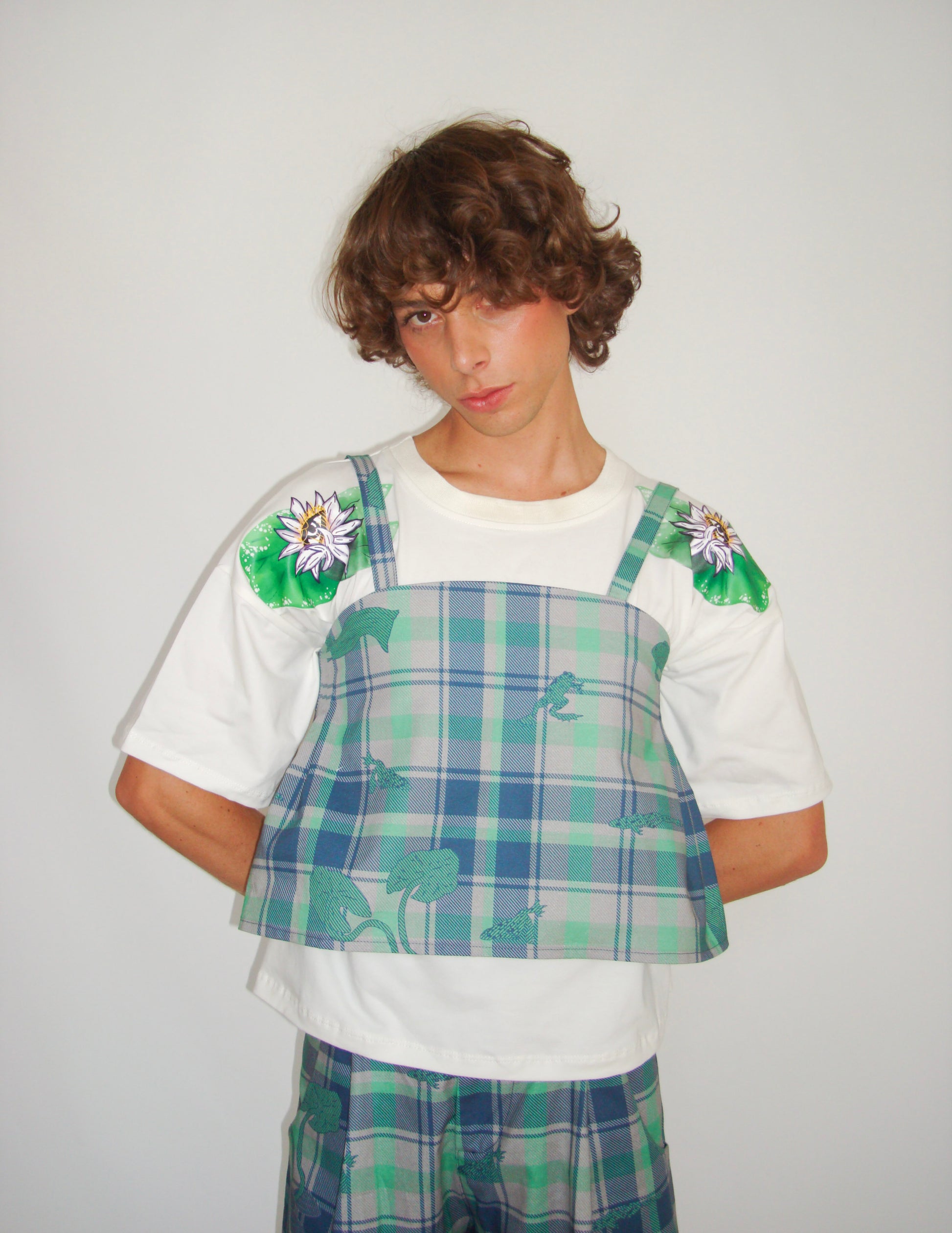 Embrace a playful twist on classic style with this unique tartan bell top. Featuring a blend of grey, blue, and green tones, this top has a soft, flared shape and charming pond print that add a hint of fun to the traditional tartan pattern.