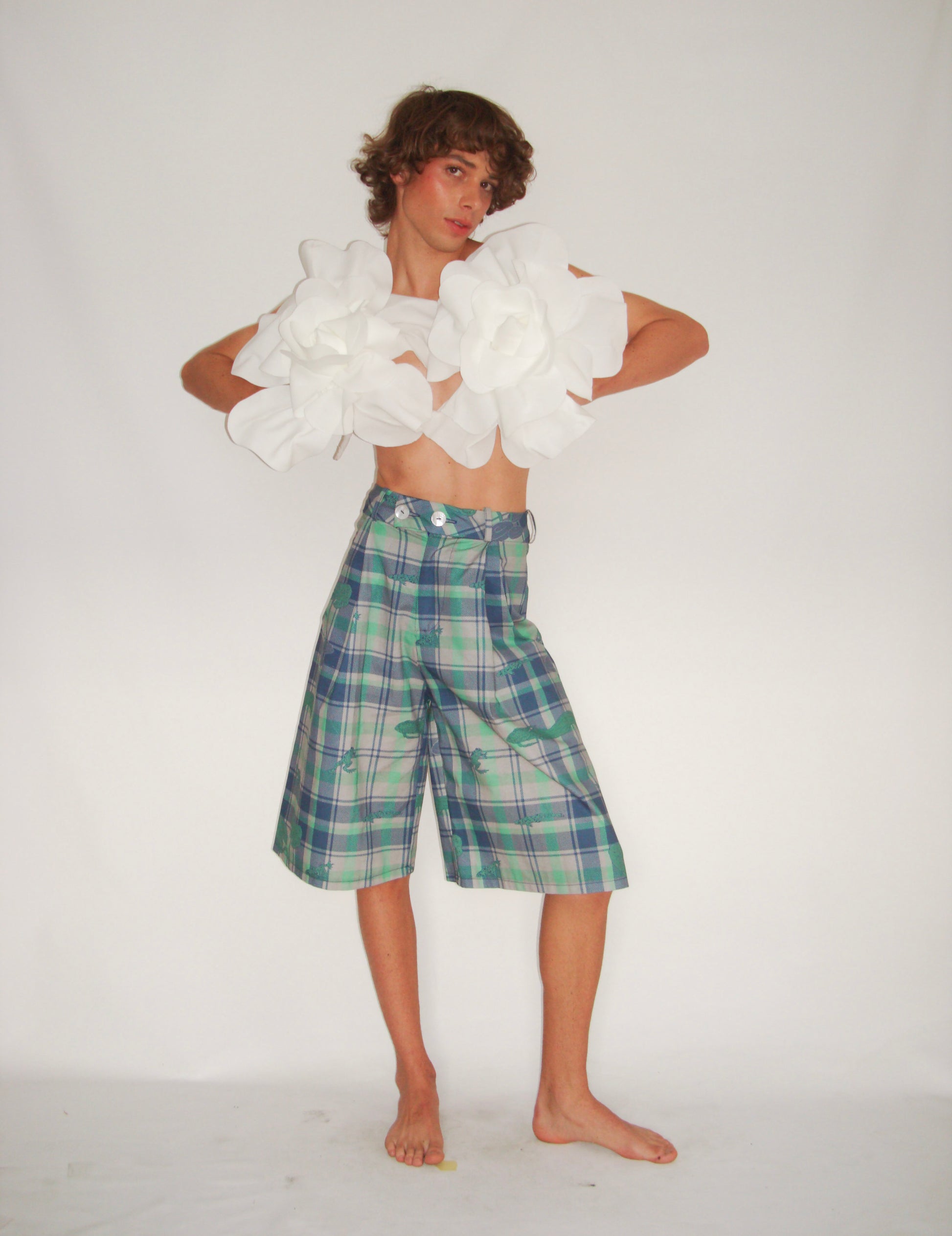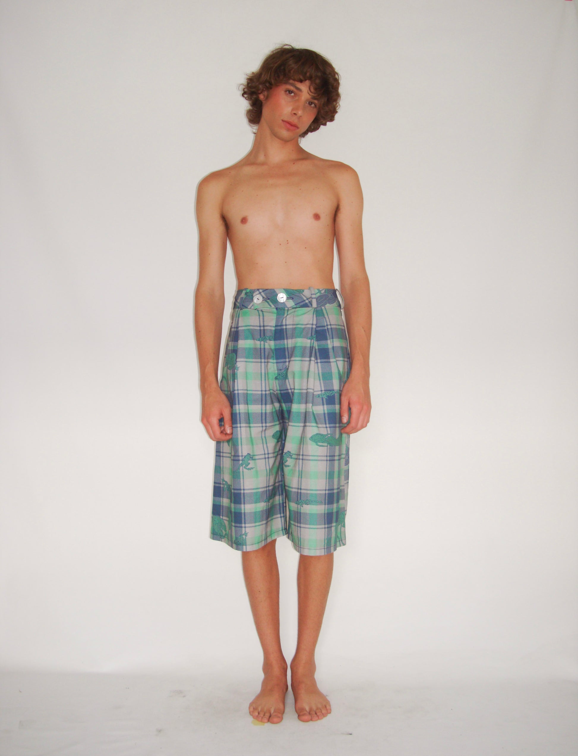 Theses unisex shorts feature a quirky reinterpretation of the traditional tartan print. a Combination of fauna and flora found within freshwater bodies, is scattered throughout this print.