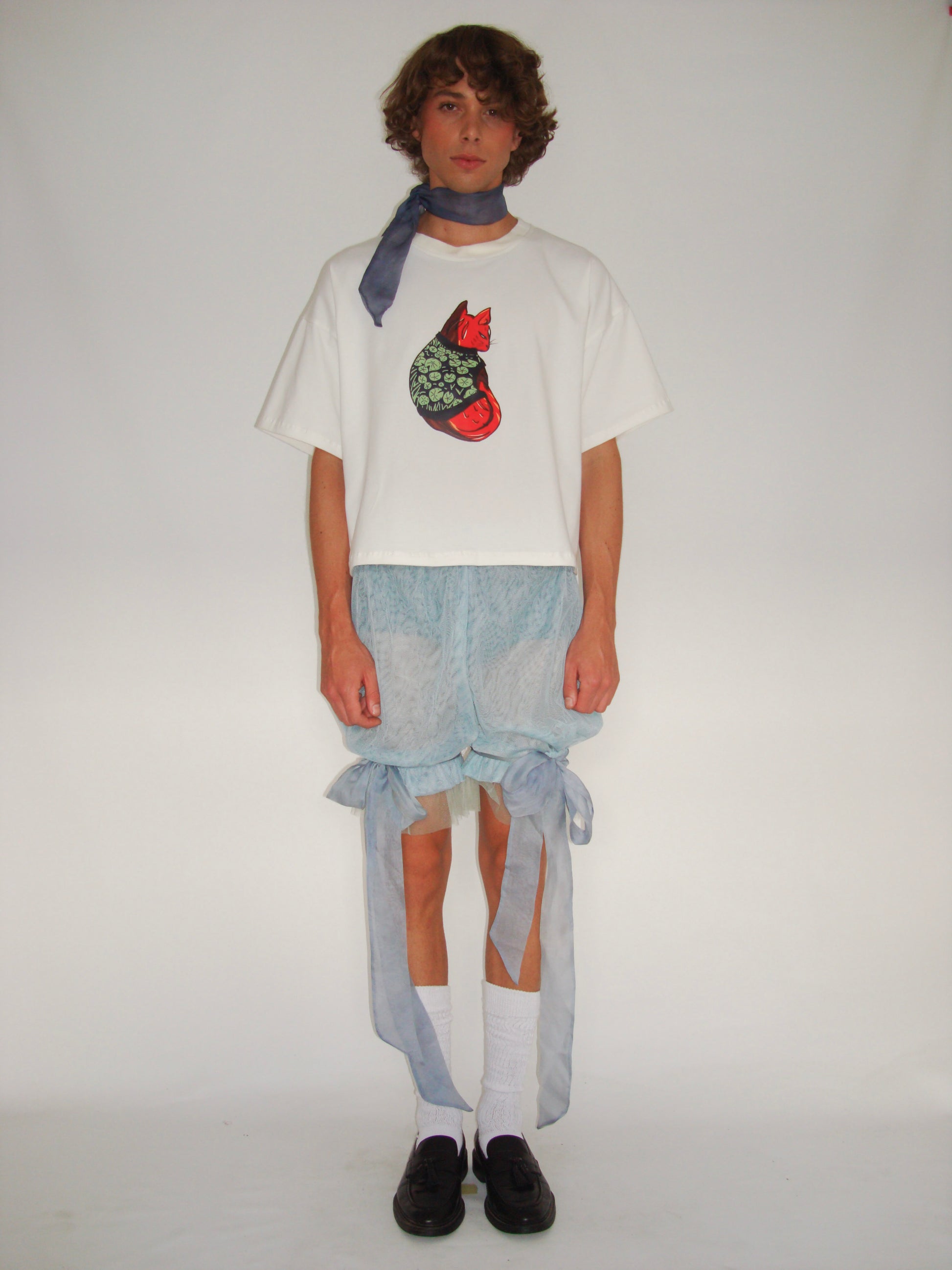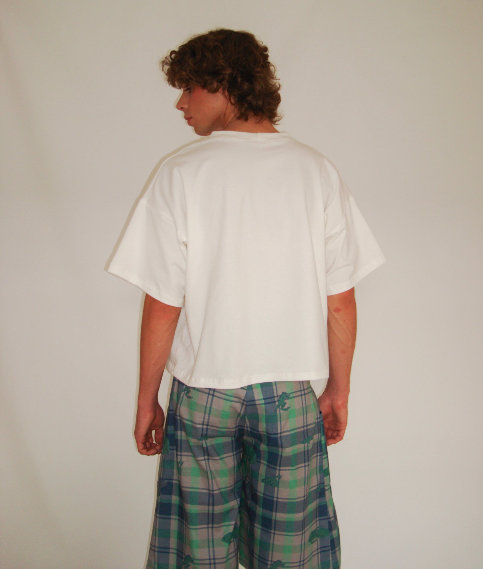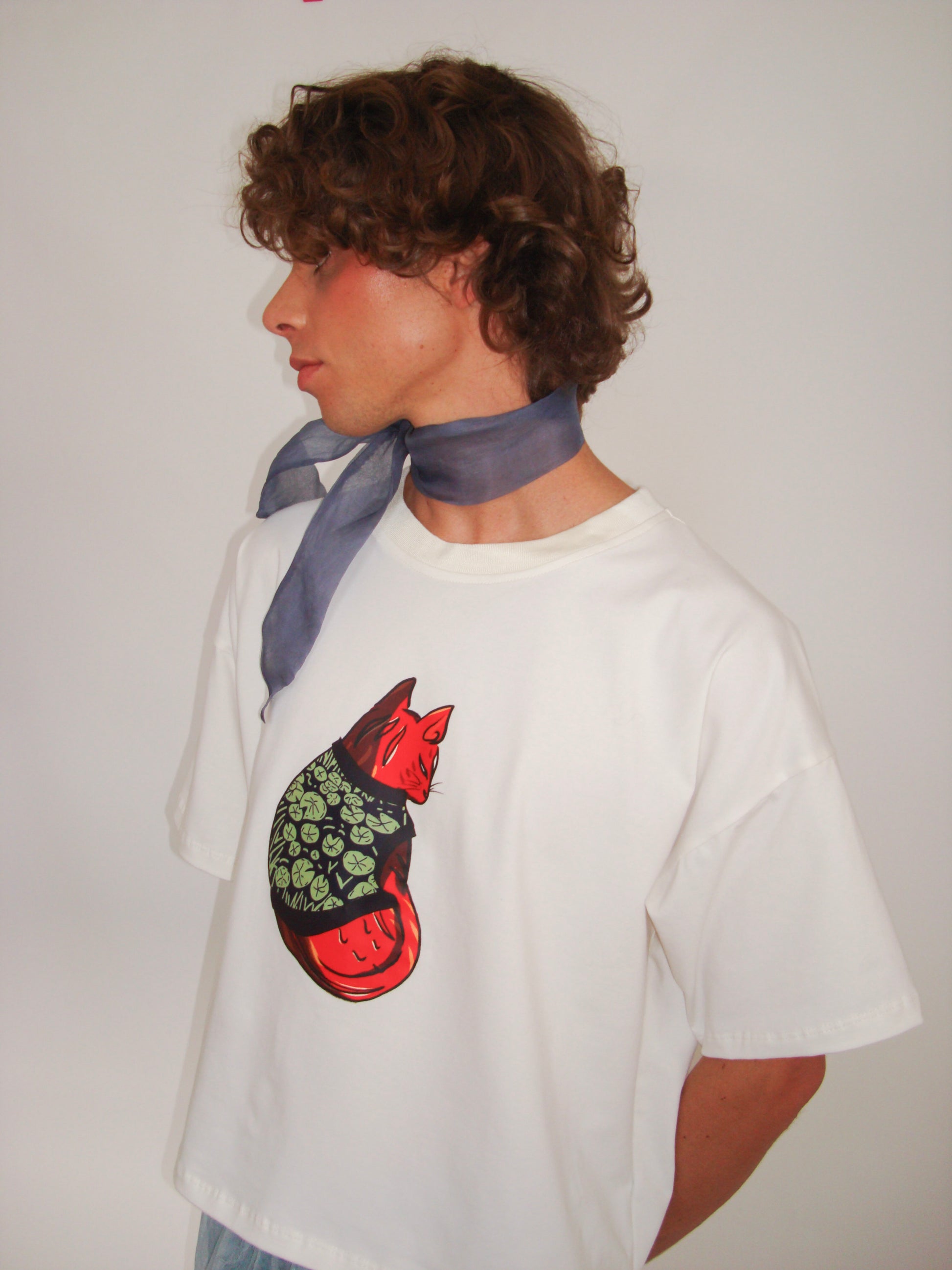 Express your individuality with this charming graphic T-shirt featuring a vibrant print of a colourful cat, exuding a whimsical and artistic flair. Crafted from soft, high-quality, unbleached cotton, this oversized white shirt combines comfort and style effortlessly. Its cropped cut and relaxed fit provides for a casual and relaxed look. Perfect for animal lovers, this playful design adds a pop of colour and personality to an everyday, casual tee.