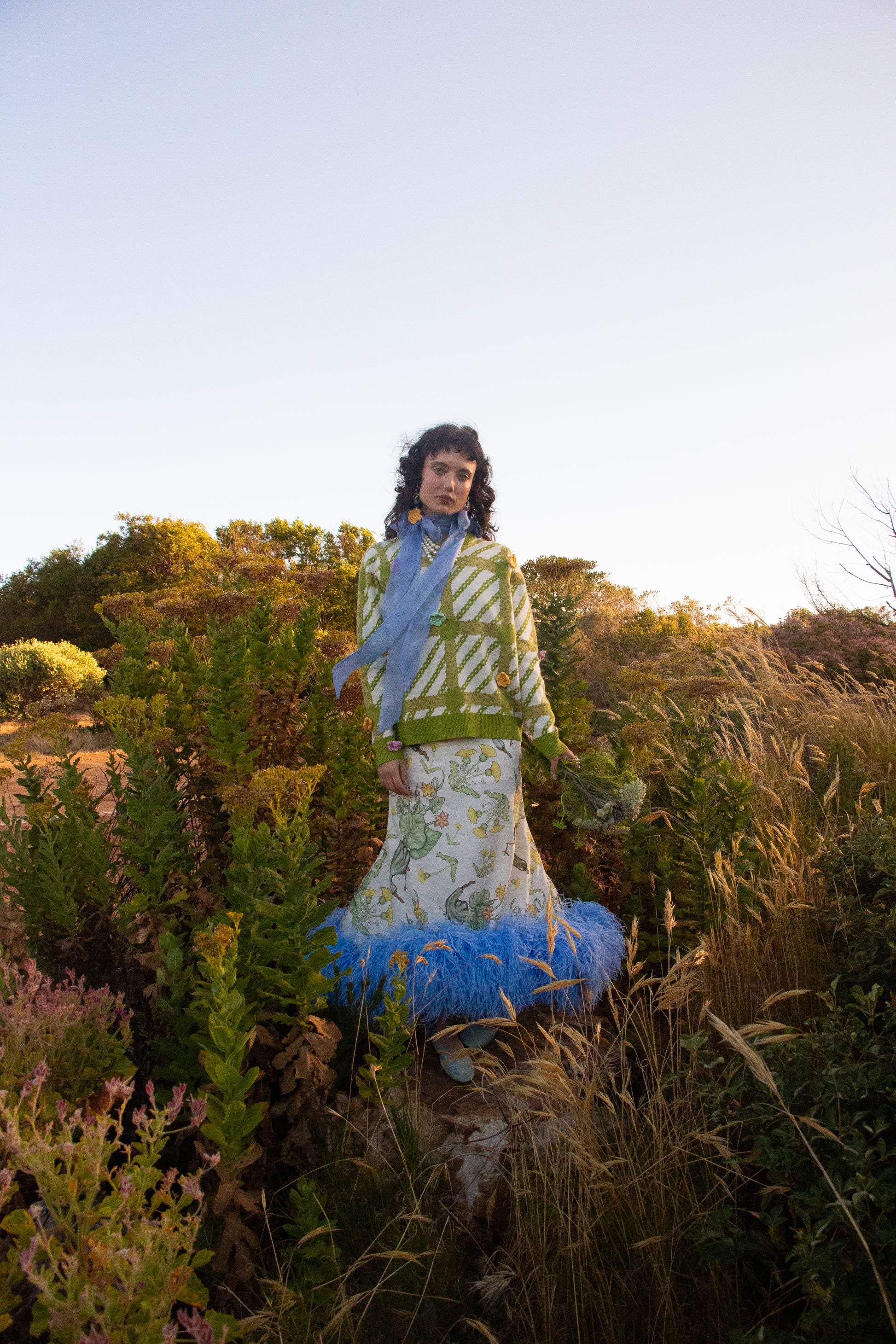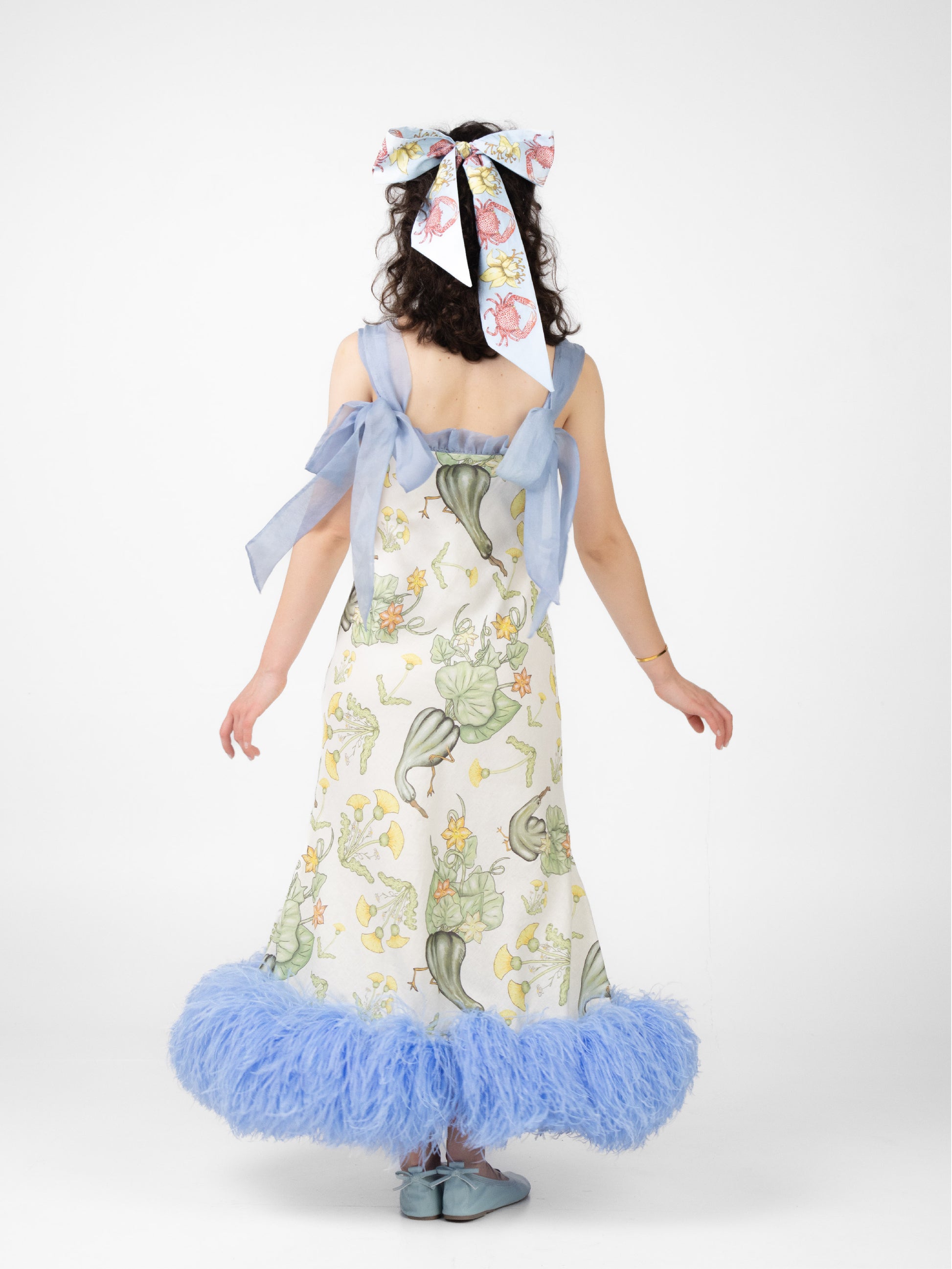 This dress depicts a rare sighting of the pumpkin bird. The pumpkin birds proudly parade their viney tails as they scamper around this bias-cut dress. The focal point of this dress is undoubtedly the baby blue ostrich feather-boa designed to be worn around the hem and is also removable to reveal hand-dyed silk organza frills. The bust is also framed with hand-dyed silk organza frills and removable silk organza straps. This dress also features adjustable elasticated straps.