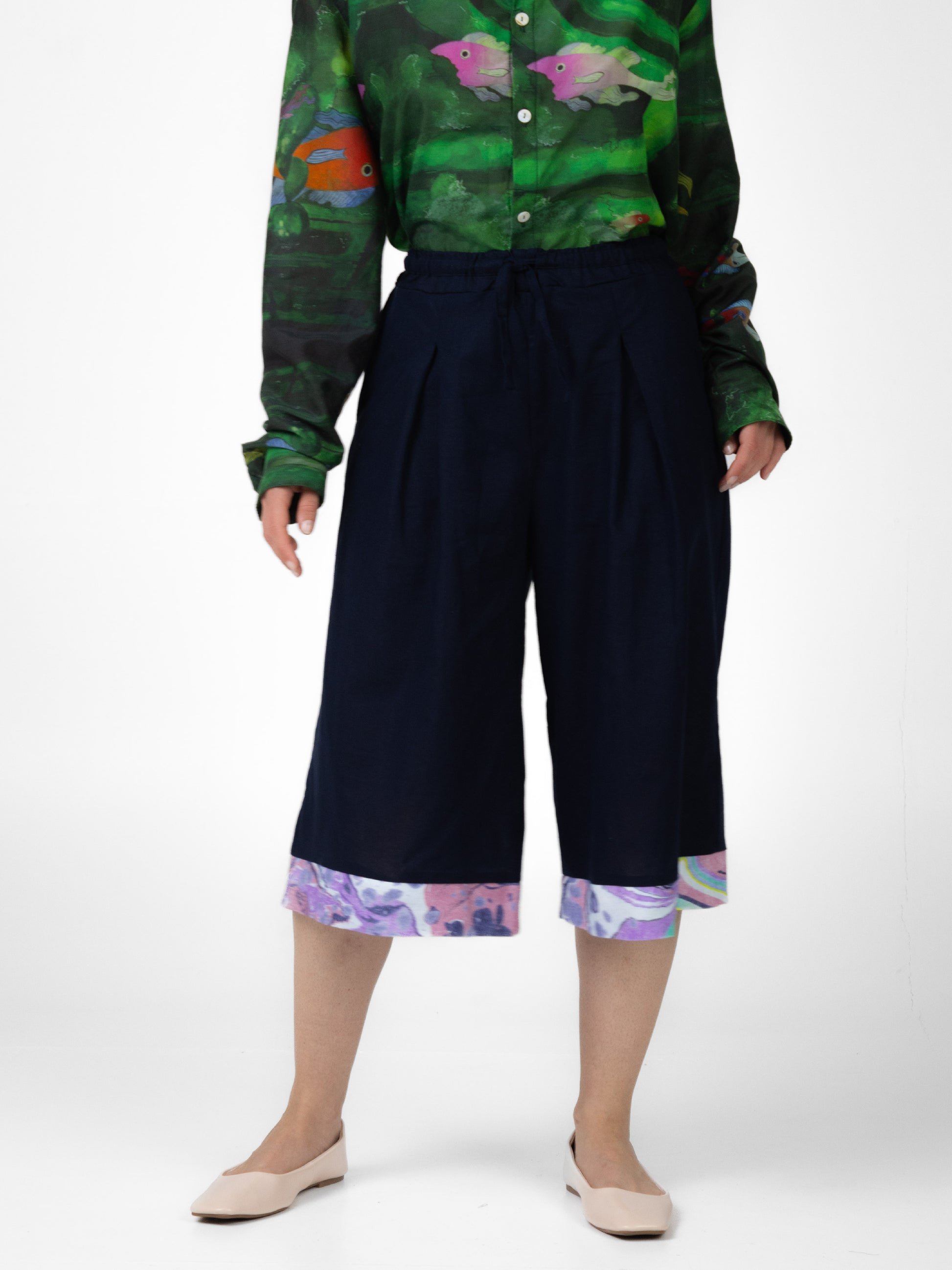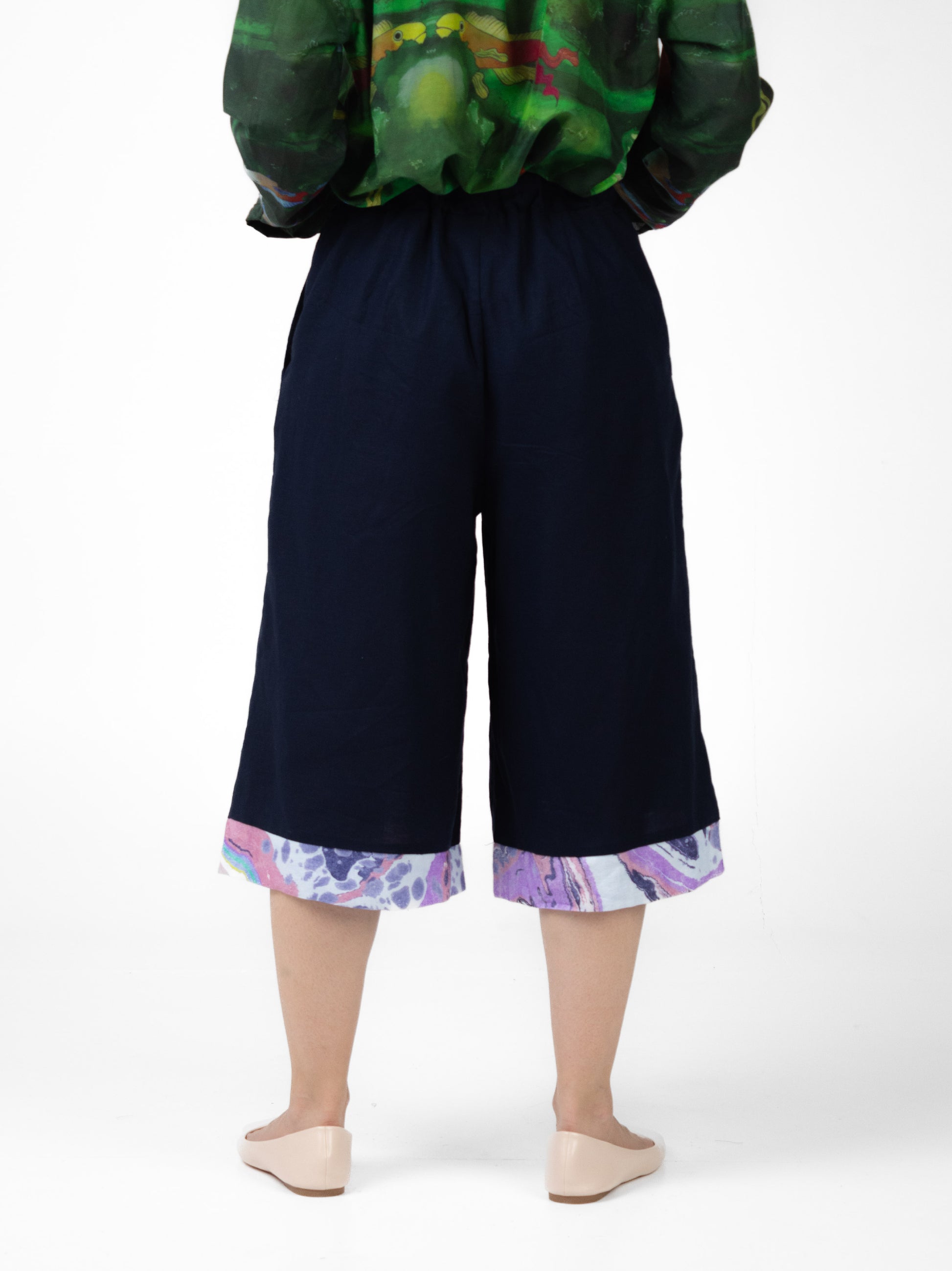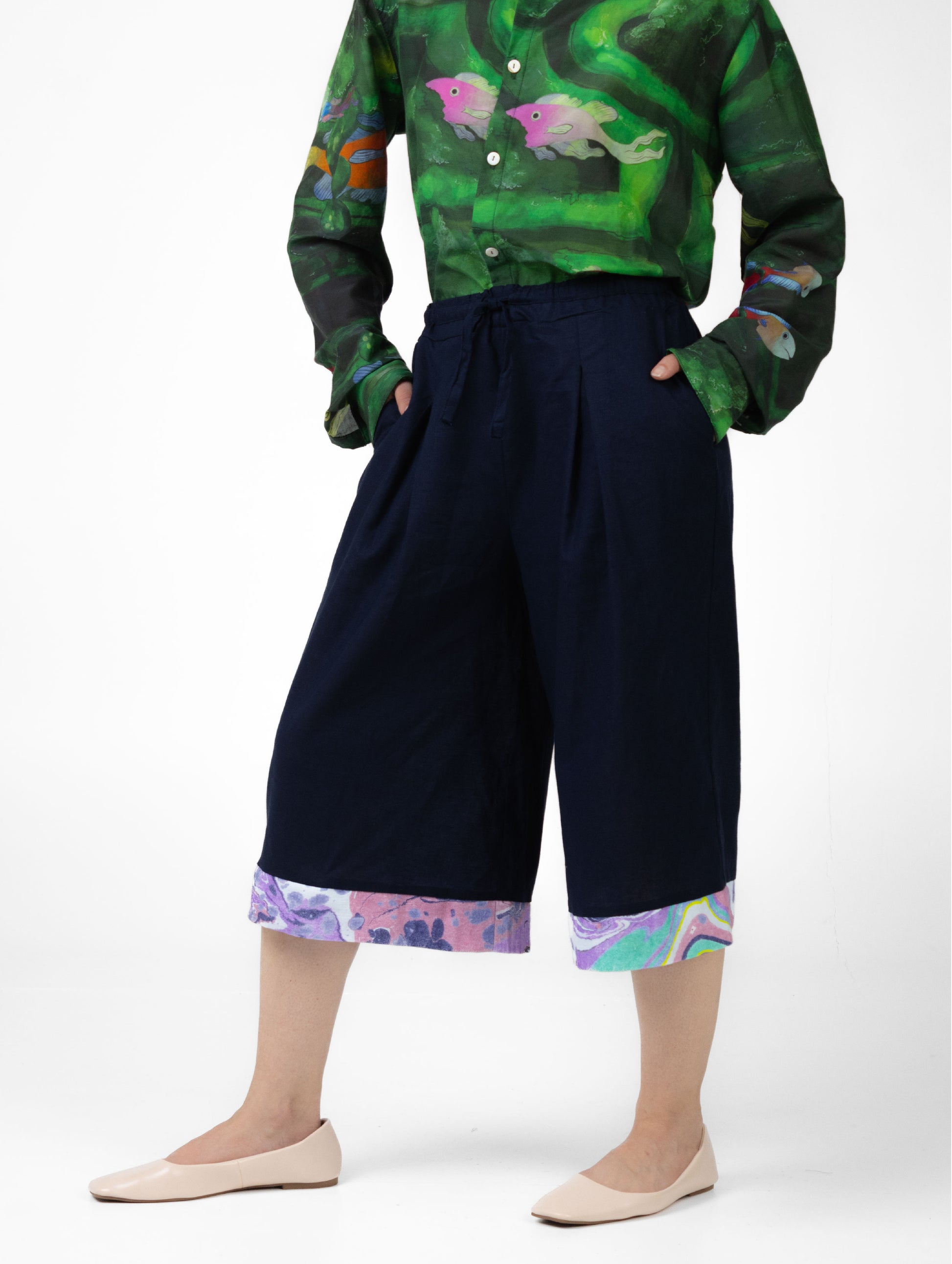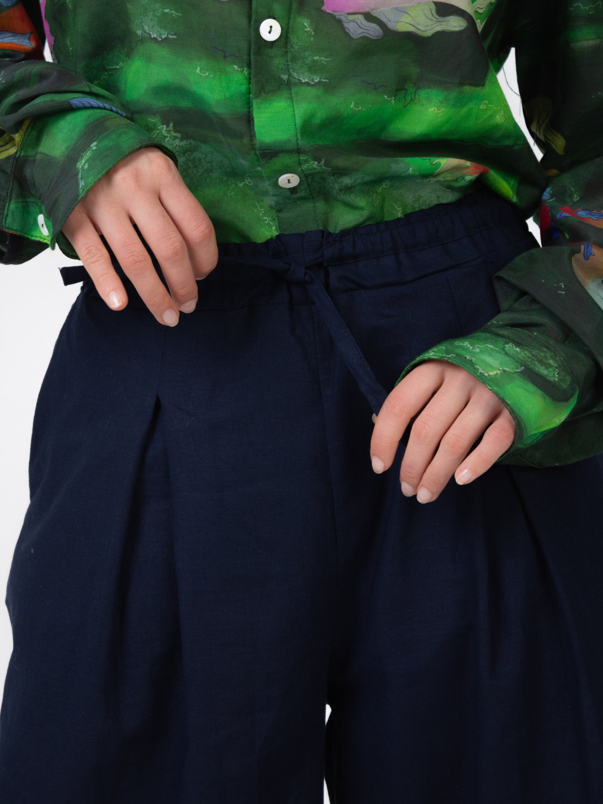 These navy trousers are made from 100% rami linen and features a contrasting suminagashi band at the hem.