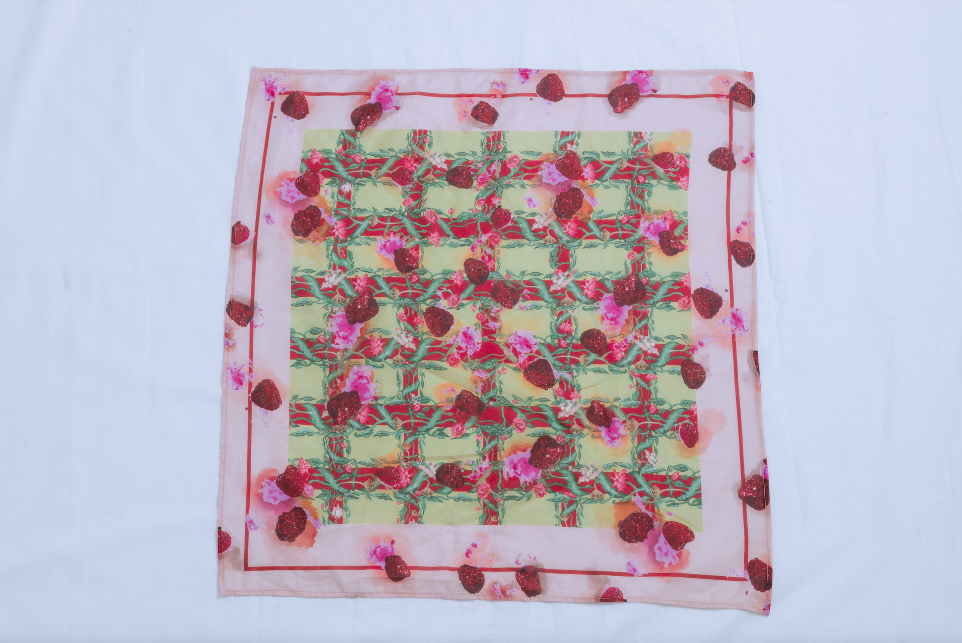 Evoking both sweetness and a bit of messiness, this unique scarf features a vivid artwork of raspberries, creating an illusion of natural stains across the fabric. Interwoven with delicate floral details and vein-like patterns, the scene is set against a nostalgic picnic blanket-inspired background. The lightweight cotton-silk blend offers a soft, airy feel.