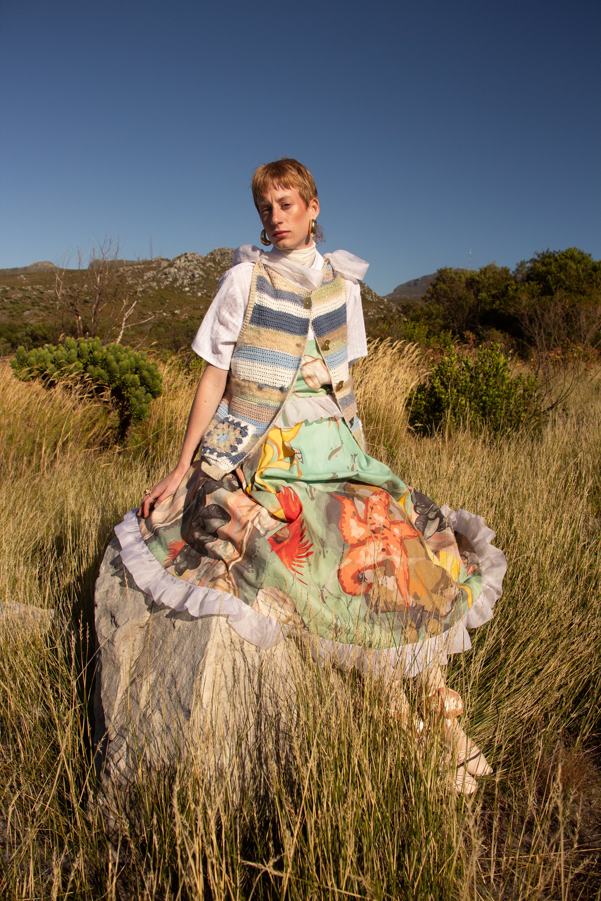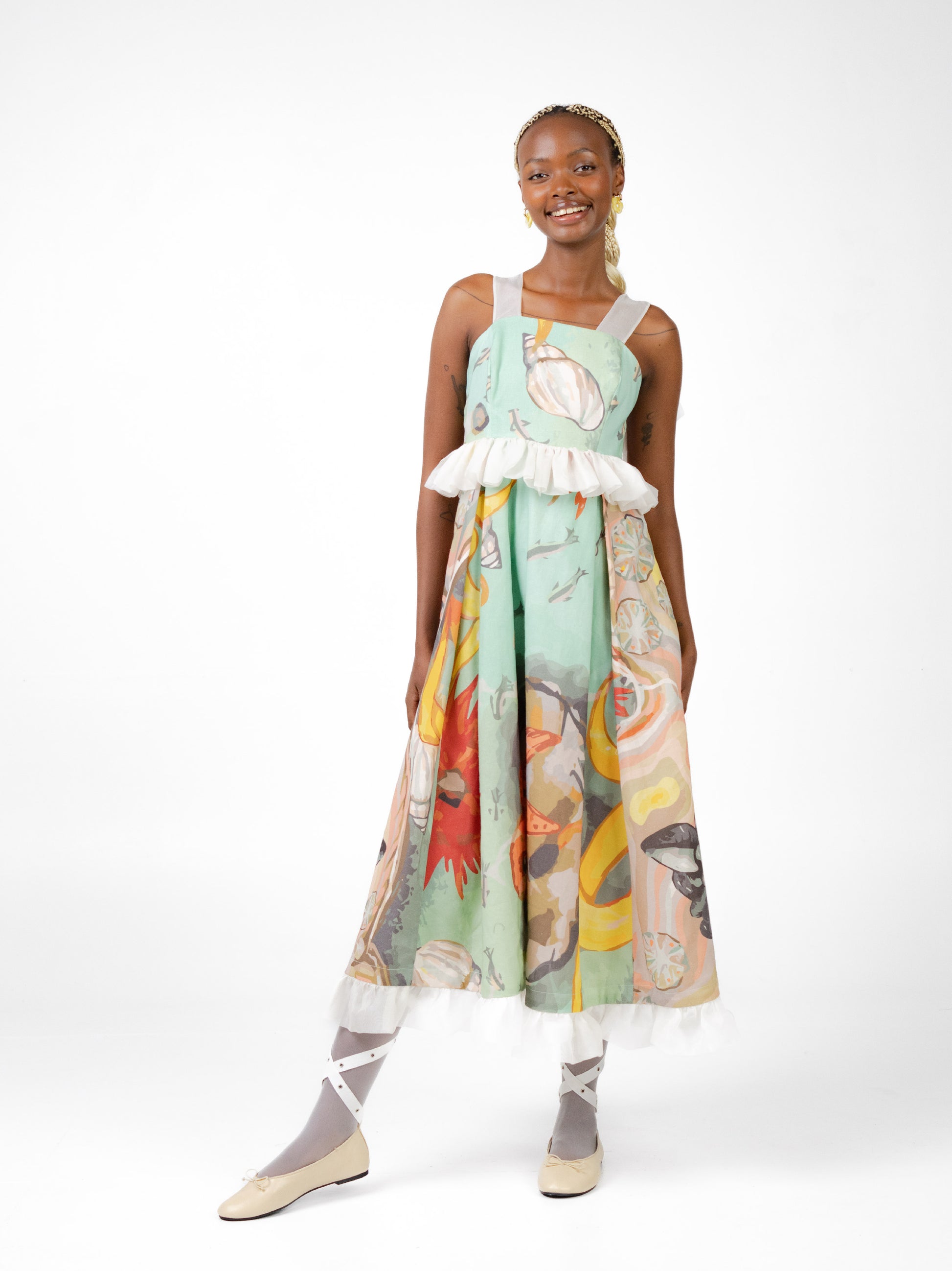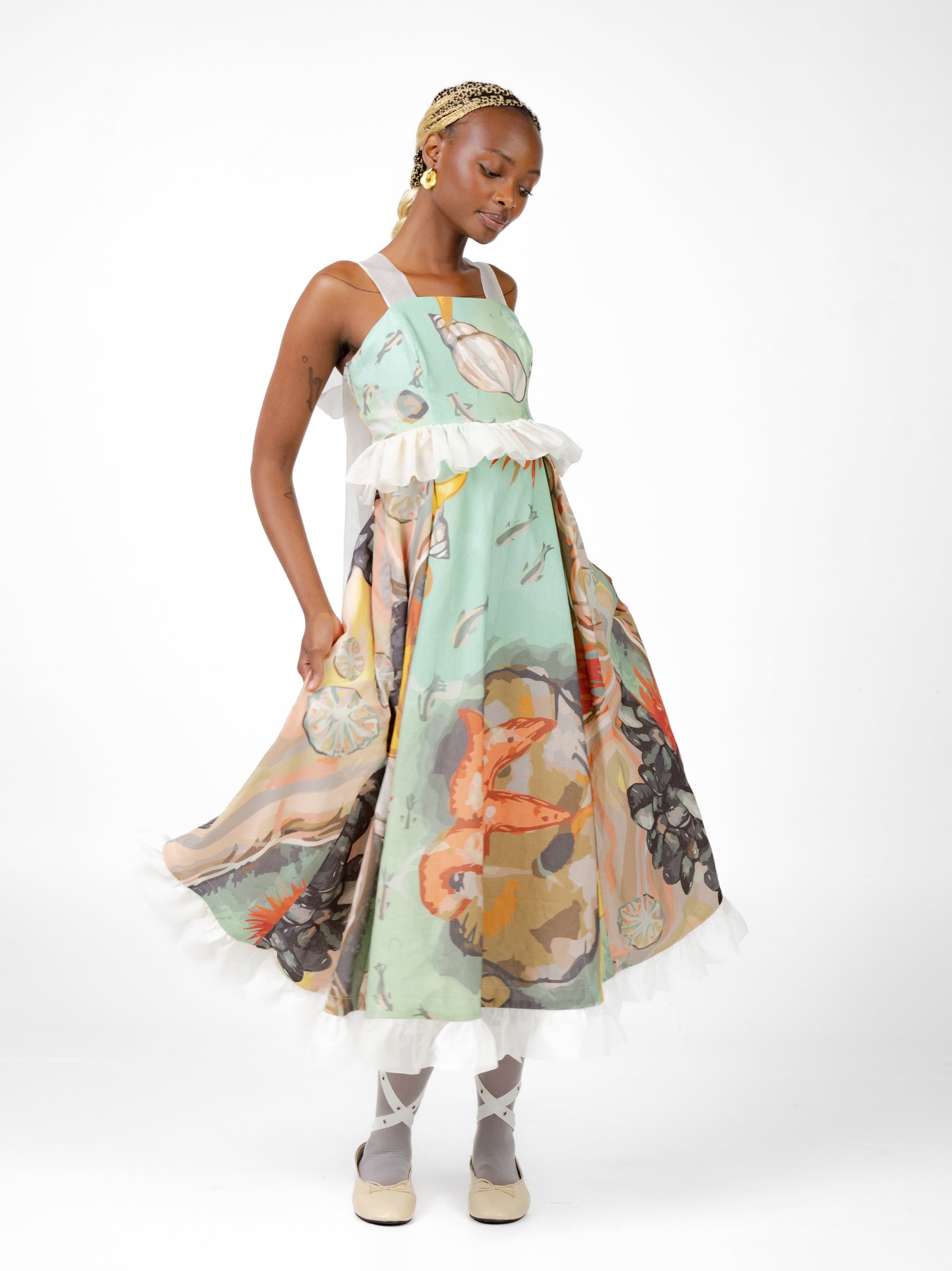 Escape to a tranquil rock pool with this voluminous fit-and-flare dress depicting a school of fish, anemones, seaweed, shells, mussels and starfish. This composition is framed with silk organza frills at the waist and hemline, finished off with elaborate organza straps. The outer of this dress is made out of a blend of organic cotton and hemp, making it a great sustainable choice.