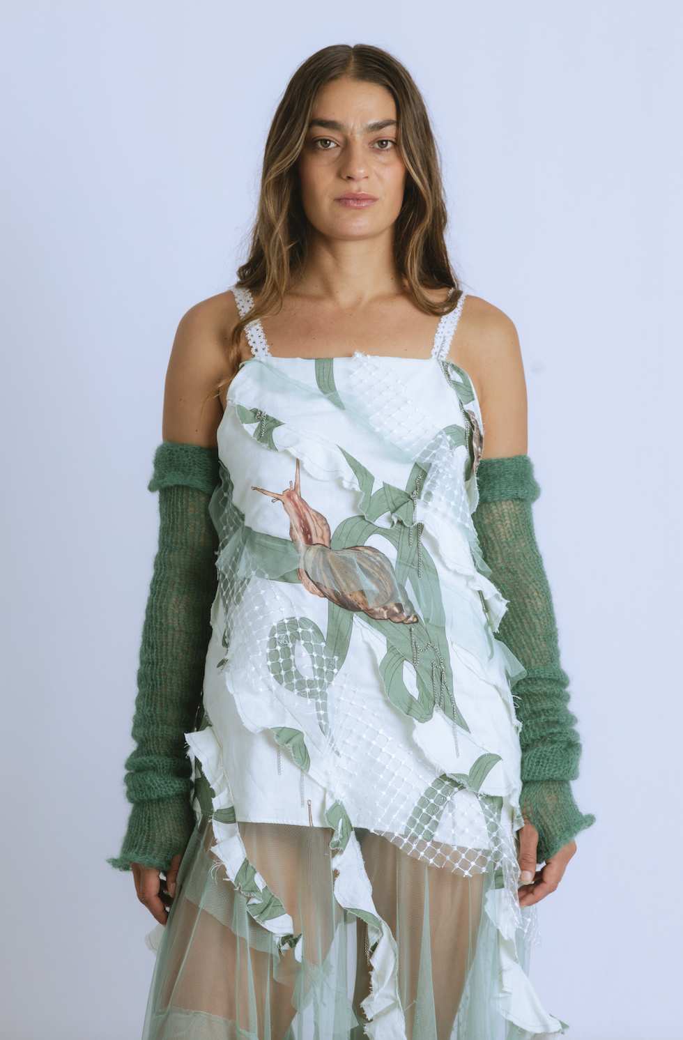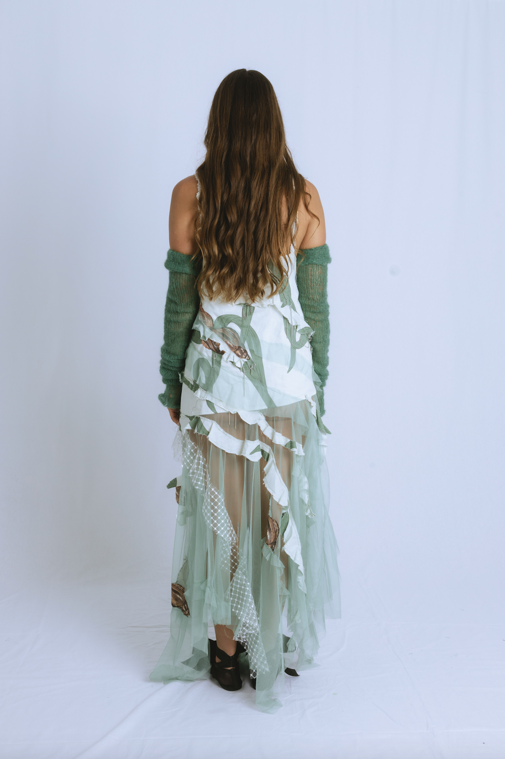 The dress is finished off with organically distressed raw edges and metal chain embellishments, mimicking the glimmering trails left behind by snails.