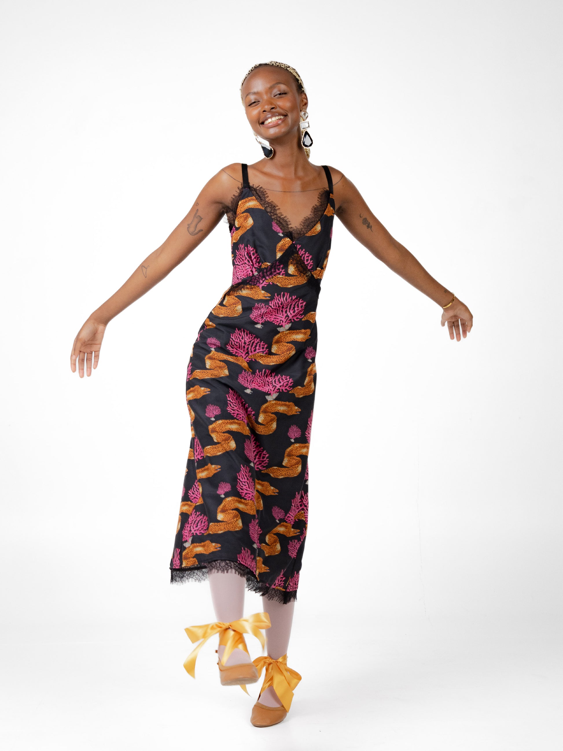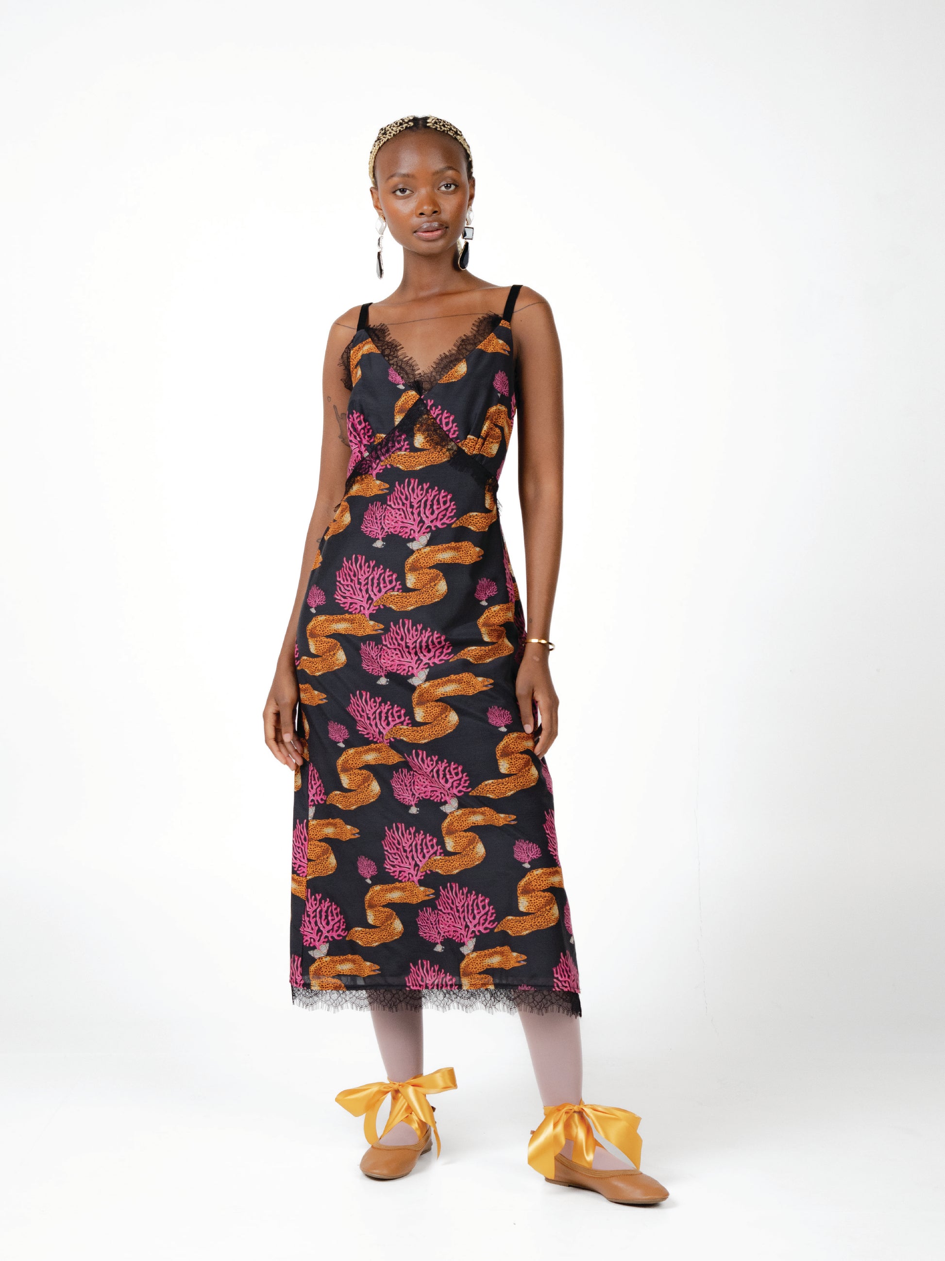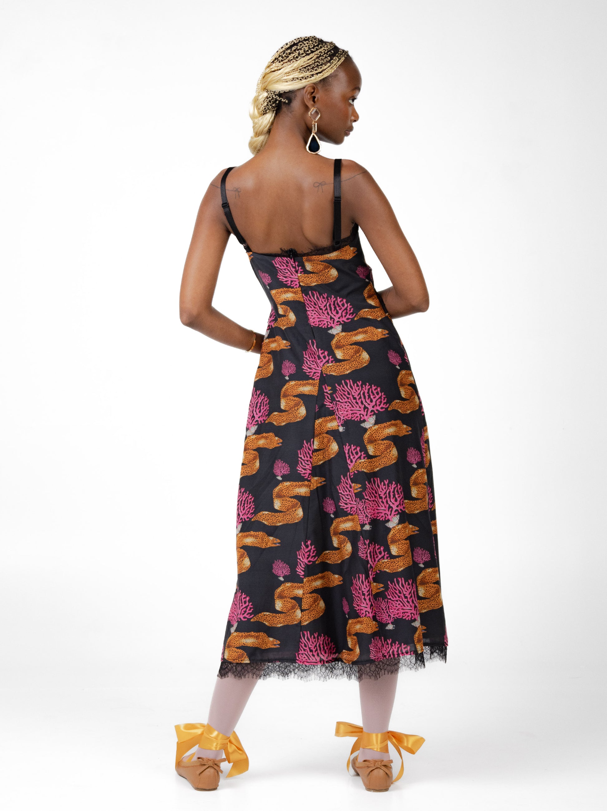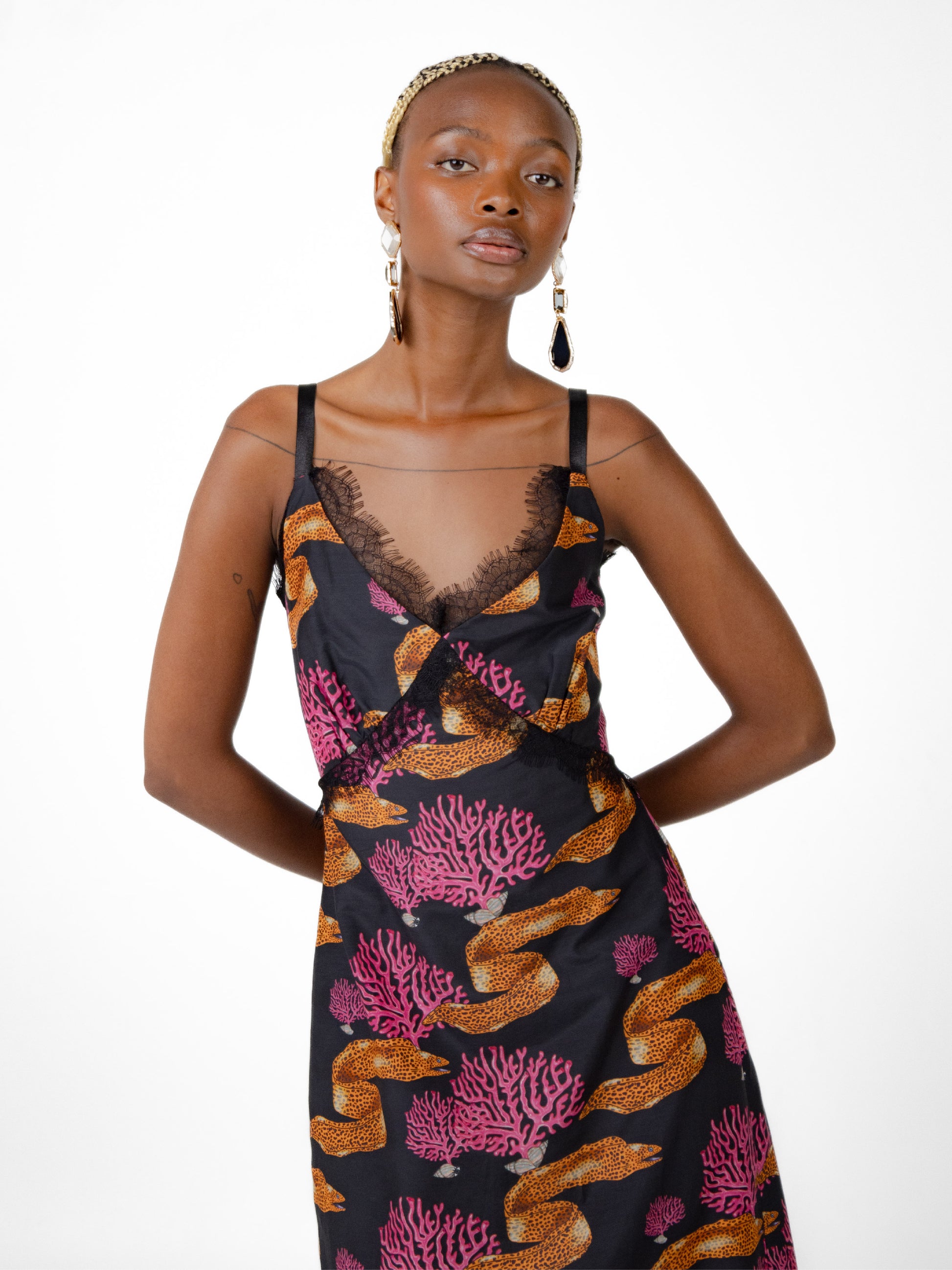 A slinky cami-style dress depicting a swarm of moray eels swimming along a choral reef. This dress is framed by a lace trim at the neckline, bust and hemline. This fully lined dress features an invisible zip at CB and adjustable elasticated straps.