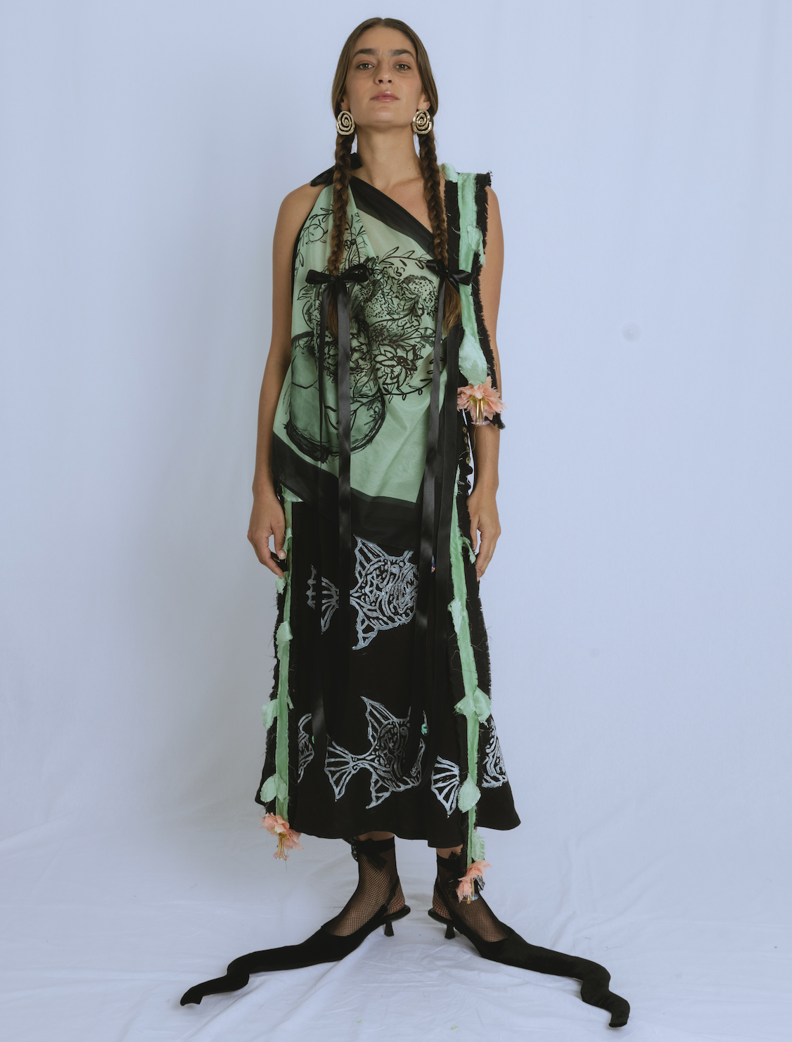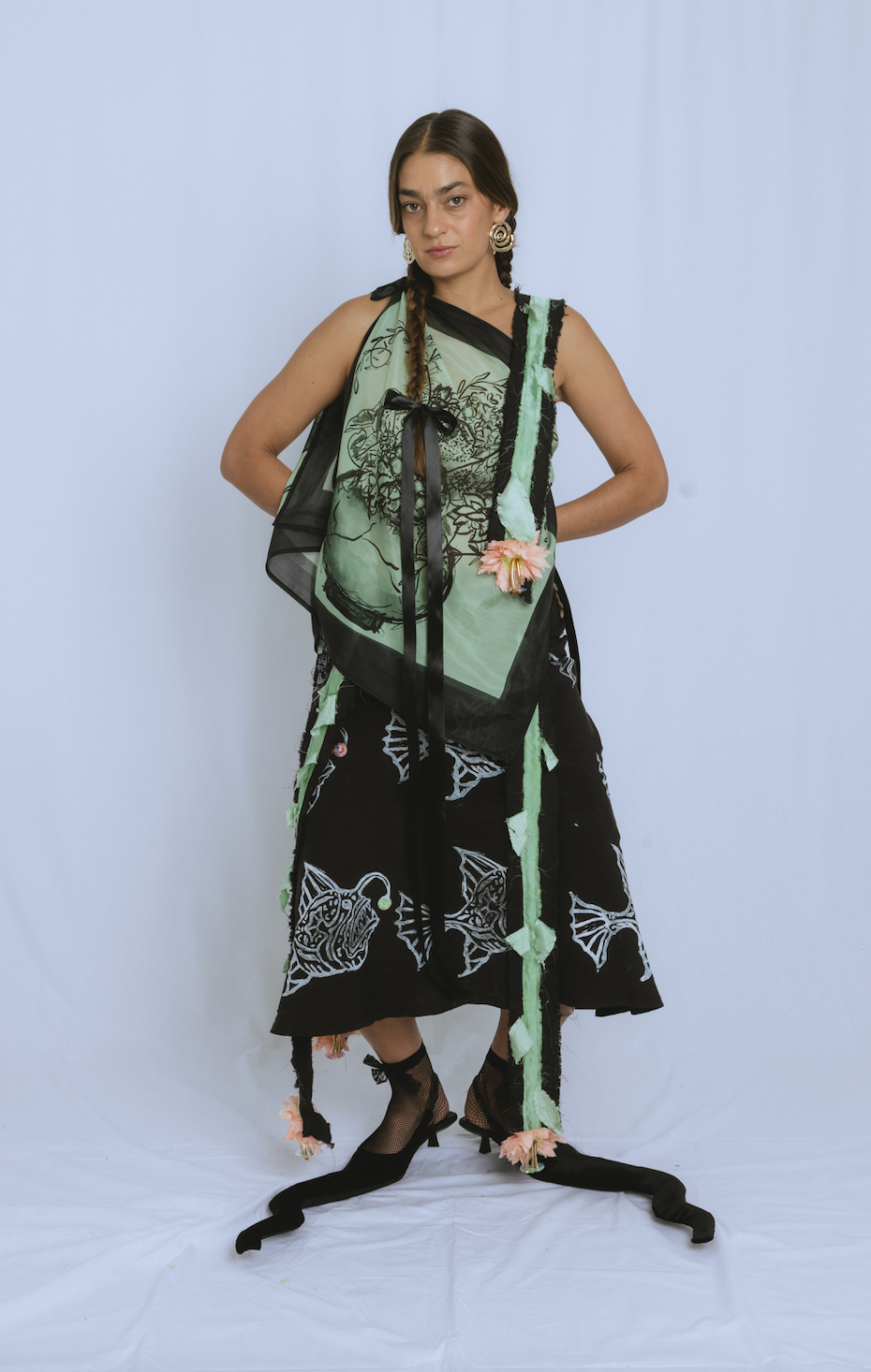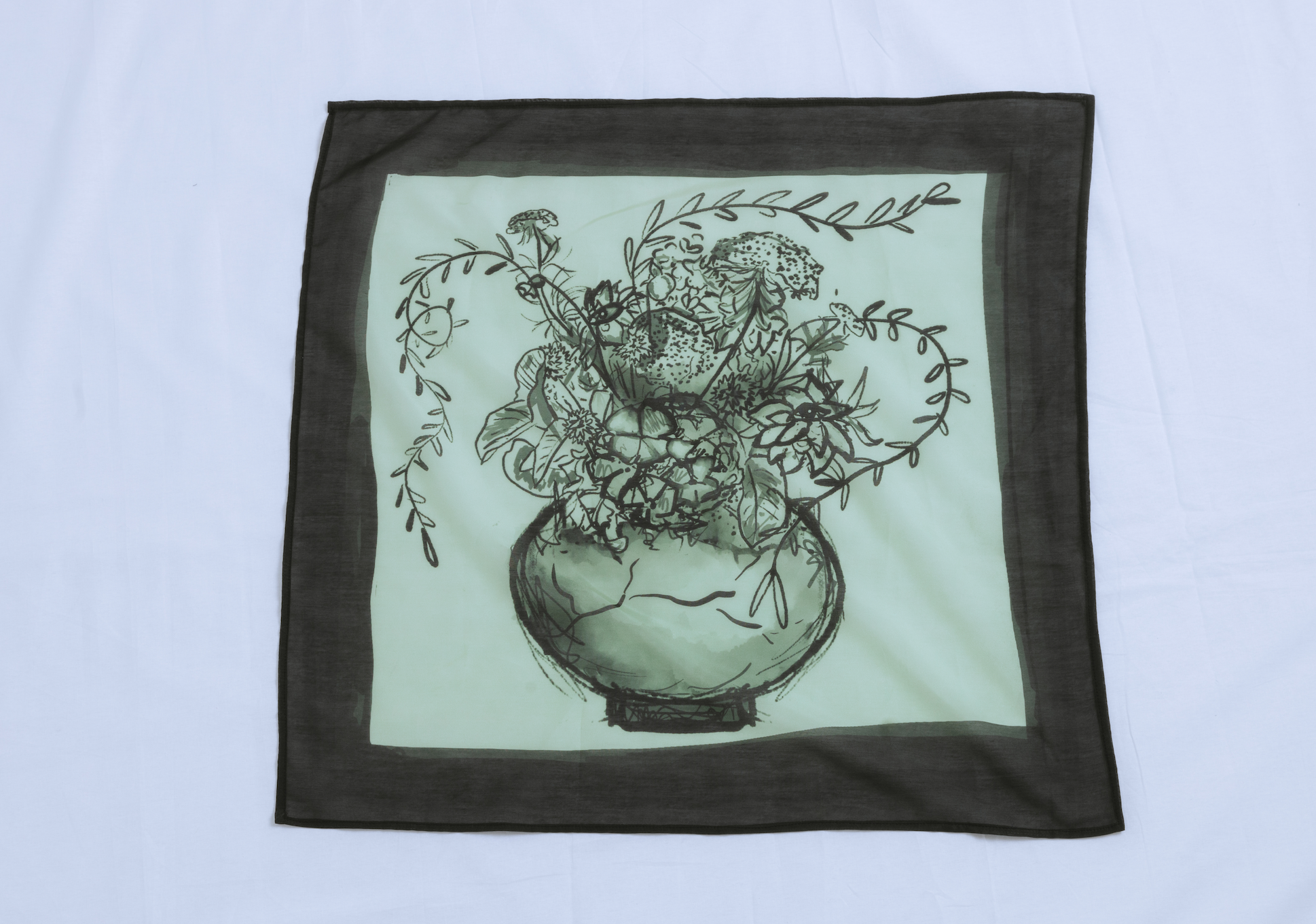 Inspired by a classic still life painting, this scarf features a delicate print of a vase and floral arrangement rendered in expressive black outlines. Set against a warm, muted neutral background , the composition evokes a sense of simplistic beauty and artistic nostalgia. Crafted from a luxurious cotton-silk blend, it drapes softly and has an elegant touch.