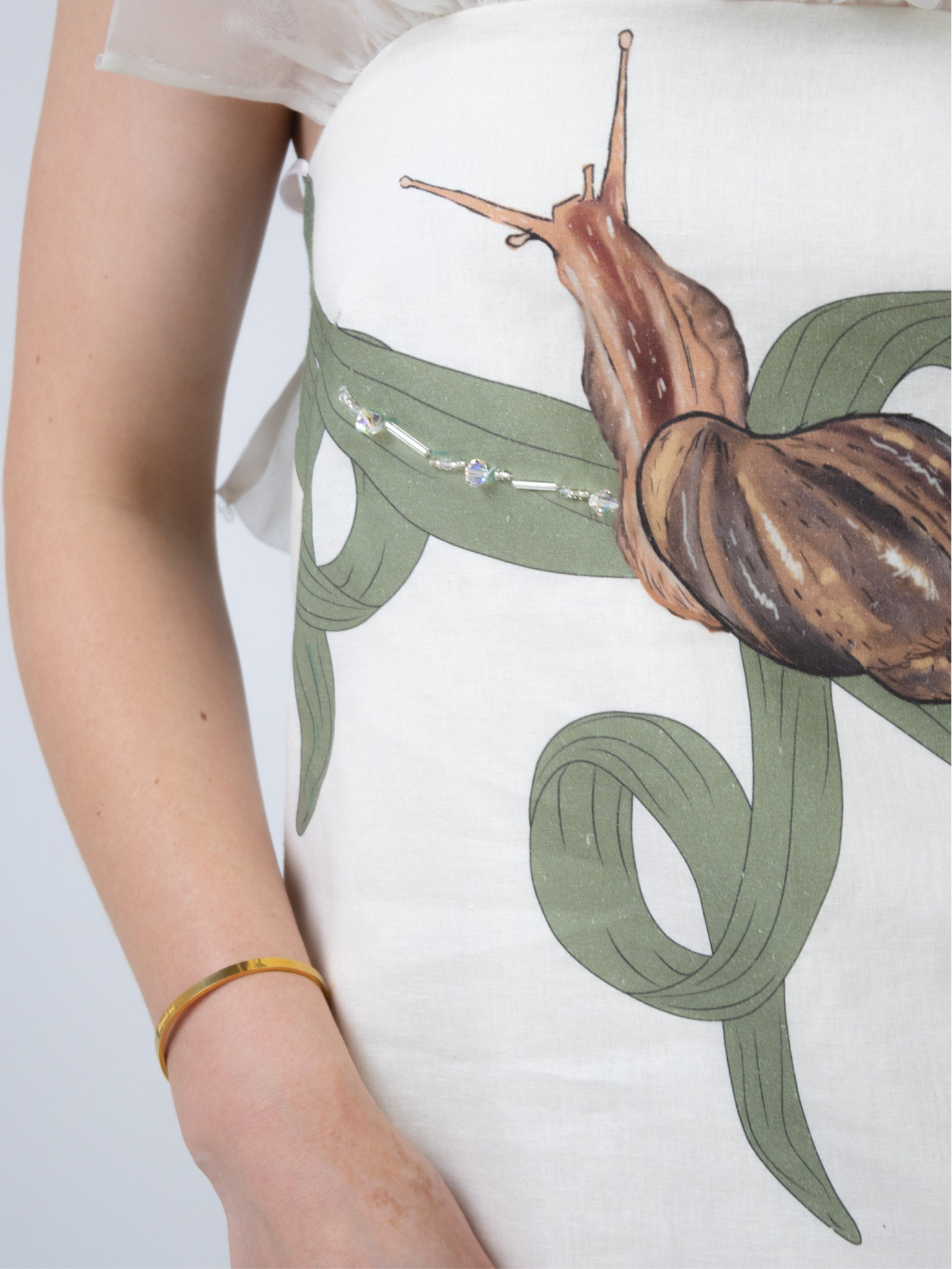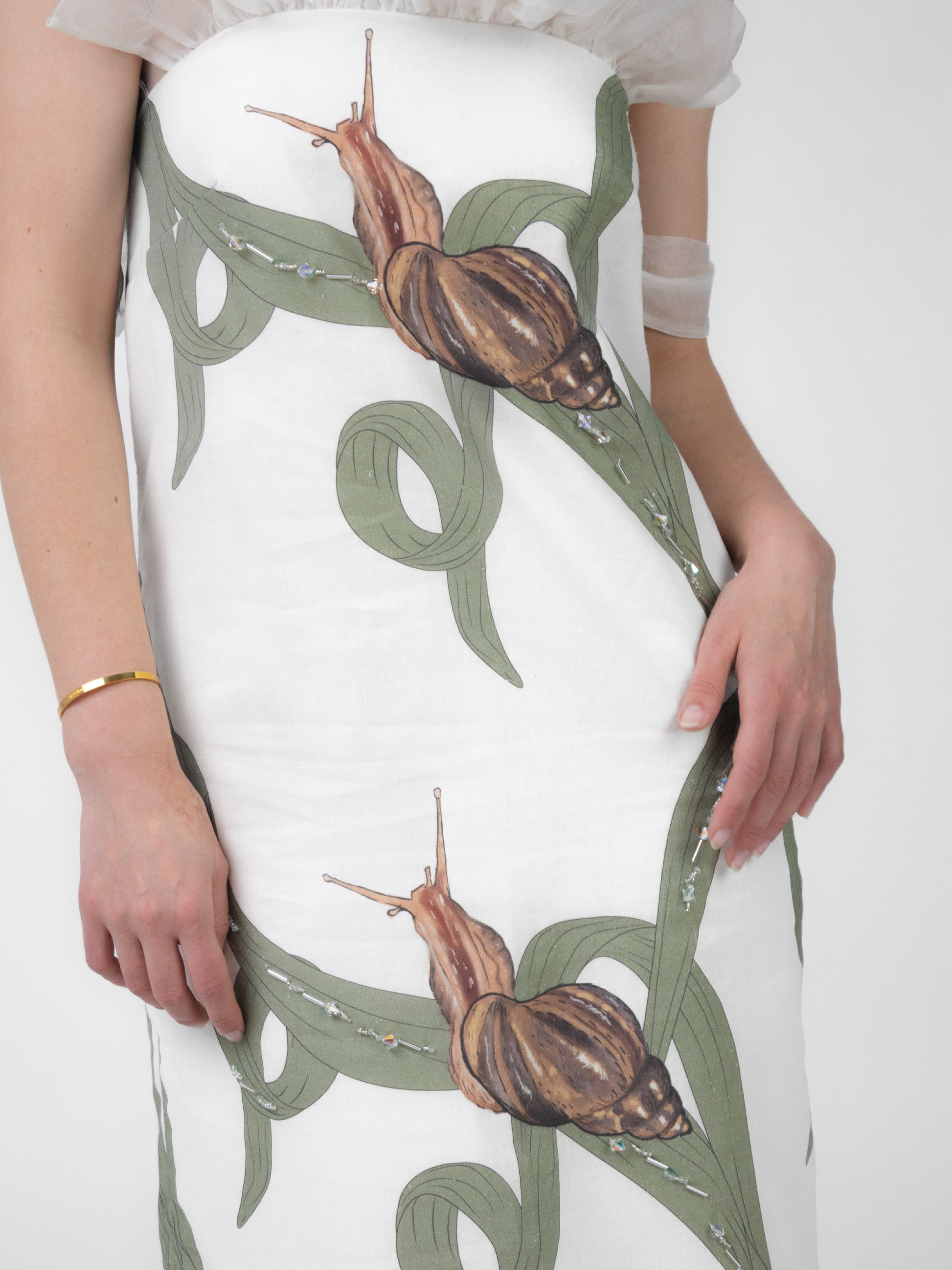 This cropped column dress depicts garden snails peacefully gliding along leaves, leaving behind their glittering trails.