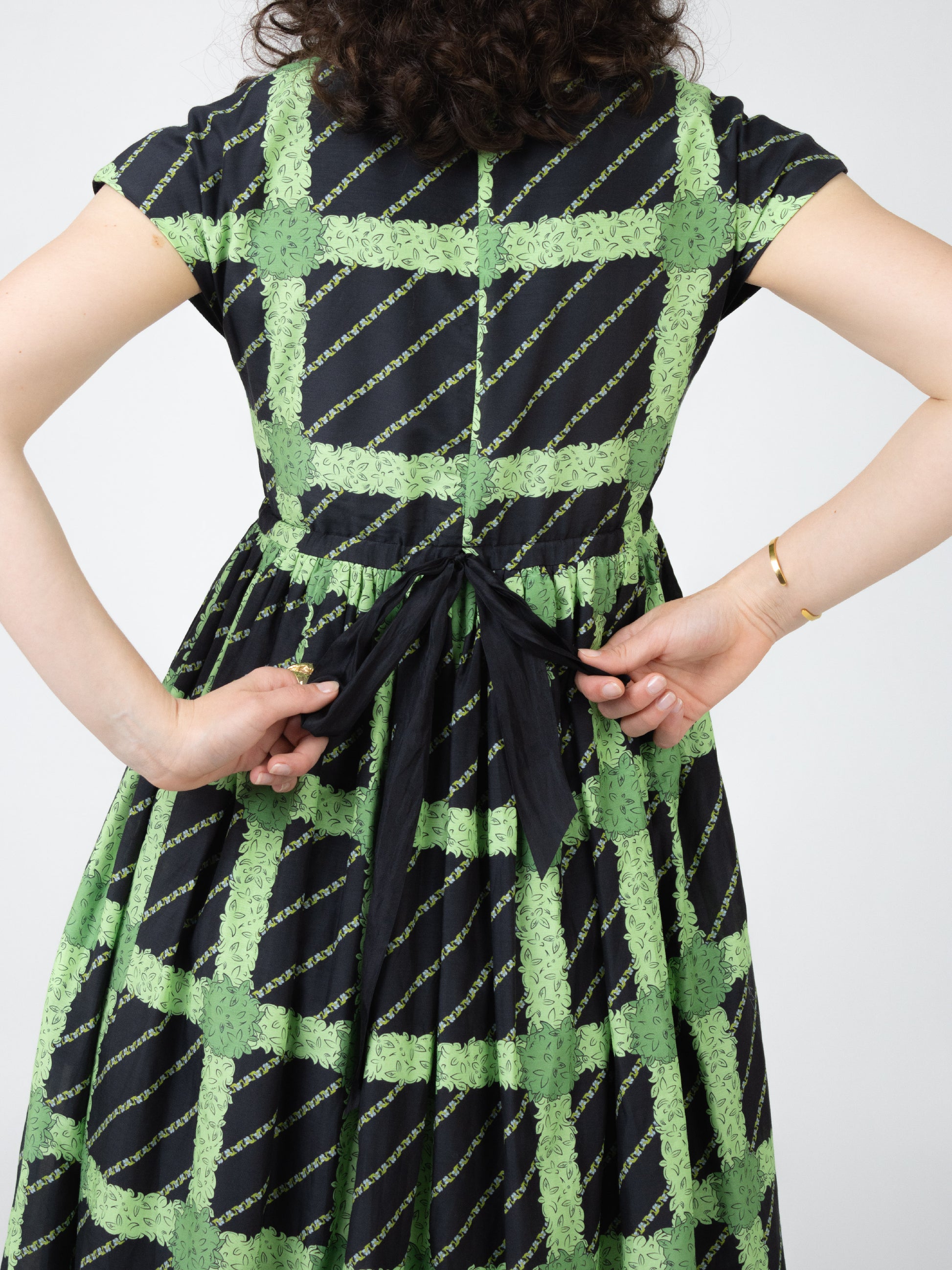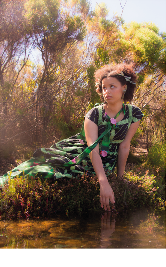 The pattern featured on this dress is a re-imagined tartan made up out of bushes, leaves and flowers.