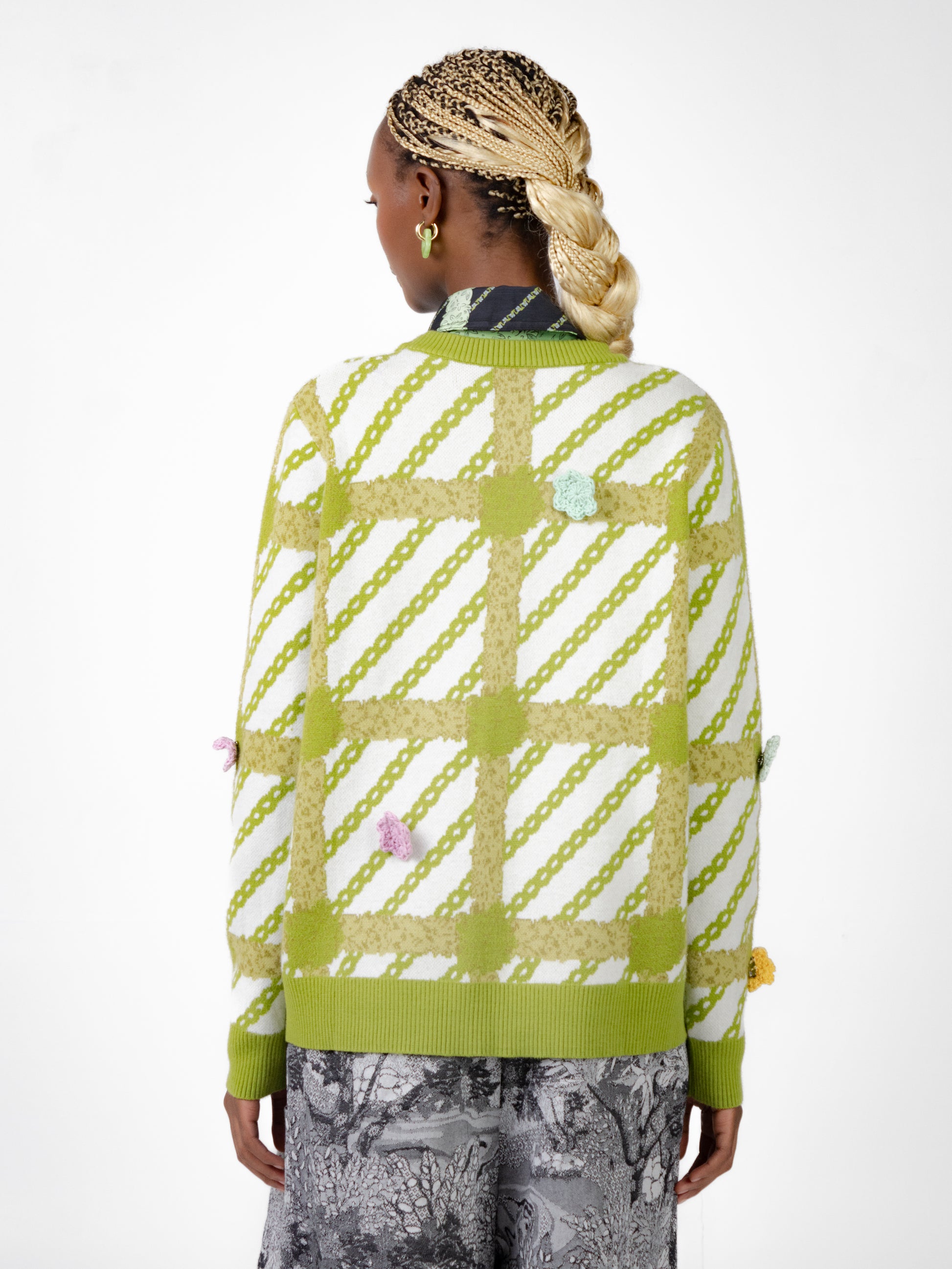 The topiary tartan jersey also comes with 9 crochet flower broaches to re-arrange for every wear.